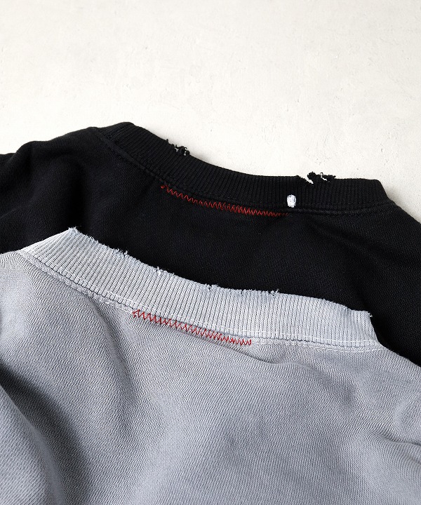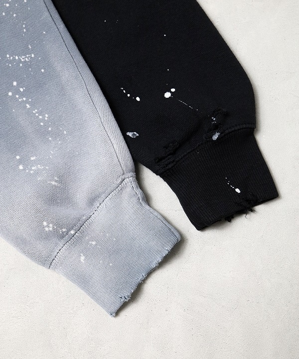 LAブランド「MOOJIMOOJI (ムージムージ)」のスプラッター加工を施したクルースウェット