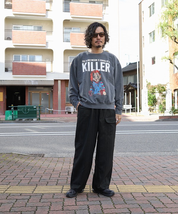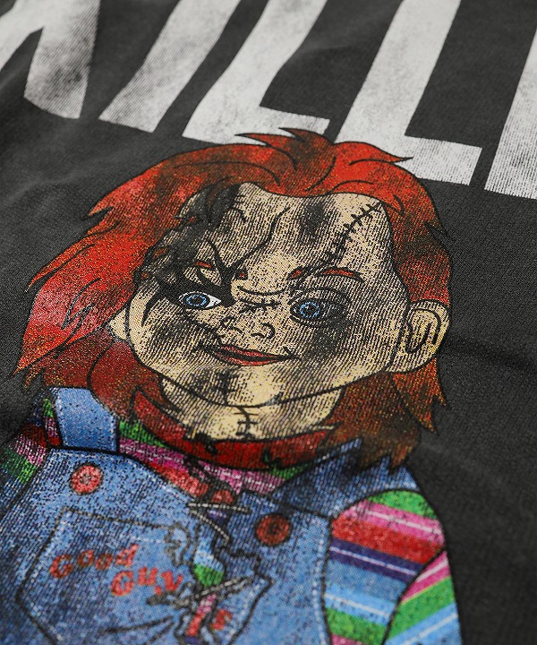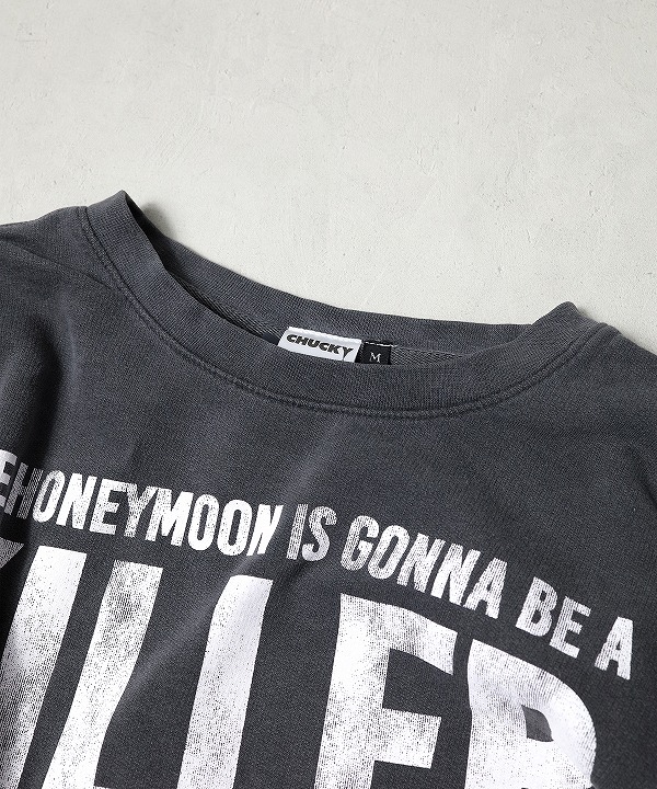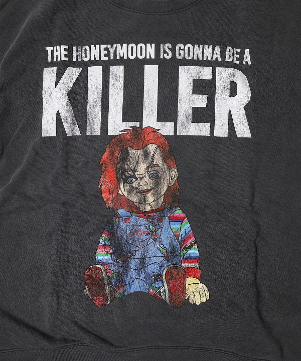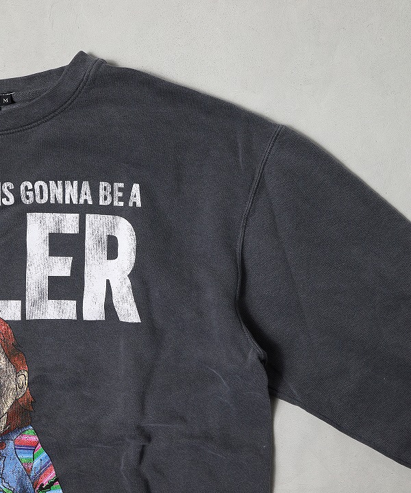 映画史に残るホラー映画「チャイルド・プレイ(CHILD'S PLAY)」の殺人鬼チャーキーのグラフィックプリントが目を引くクルースウェットです。