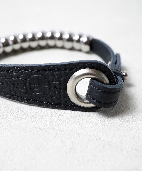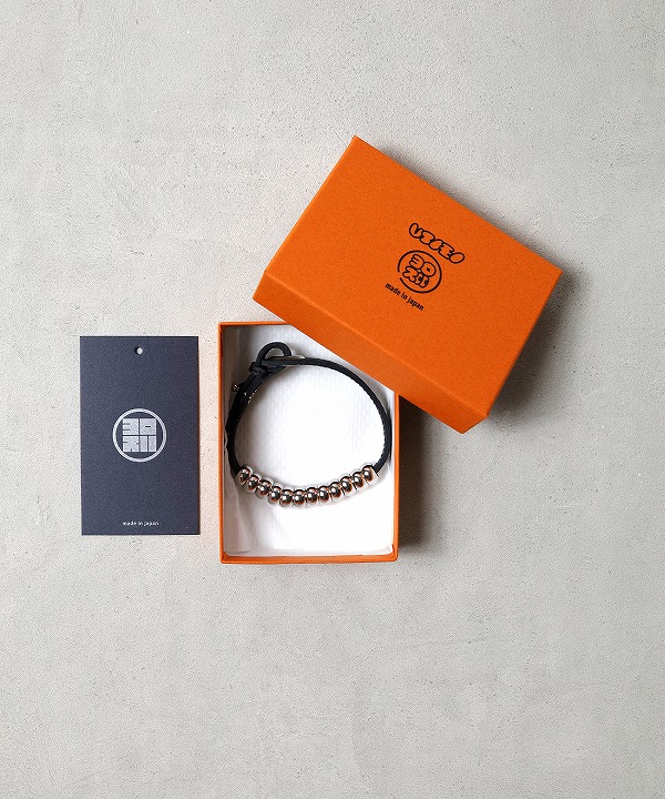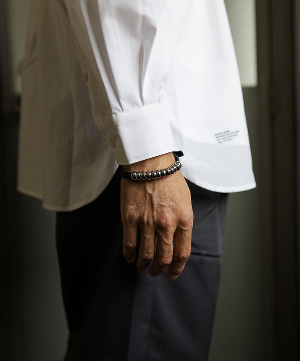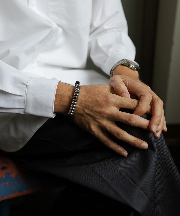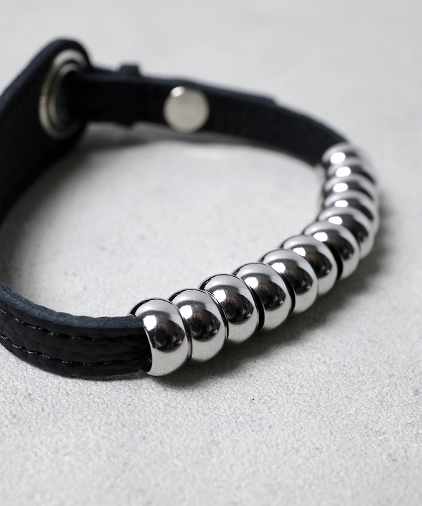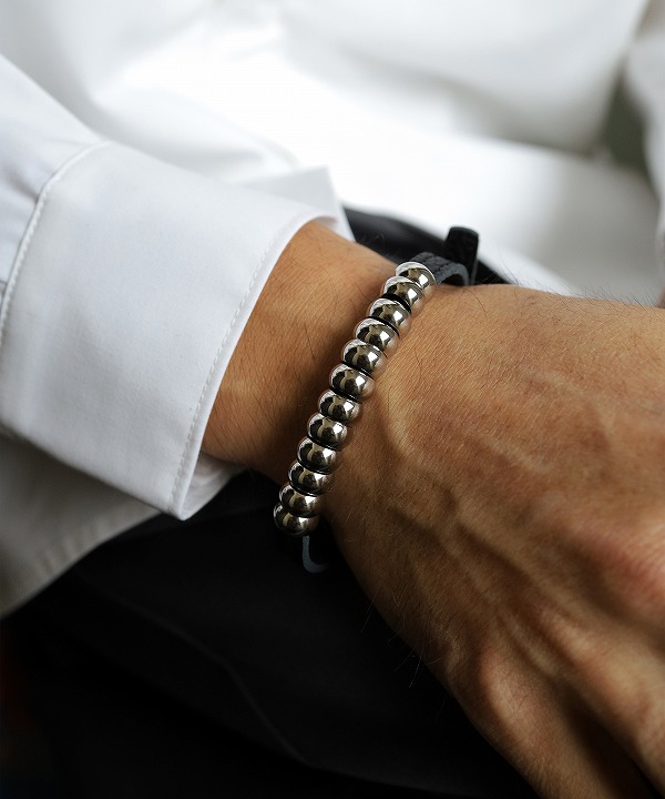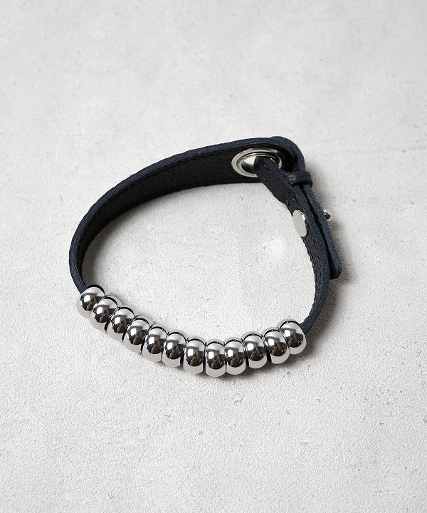 合金ビーズが12個配された腕輪。長さをギボシ金具にて調節可能な仕様です。