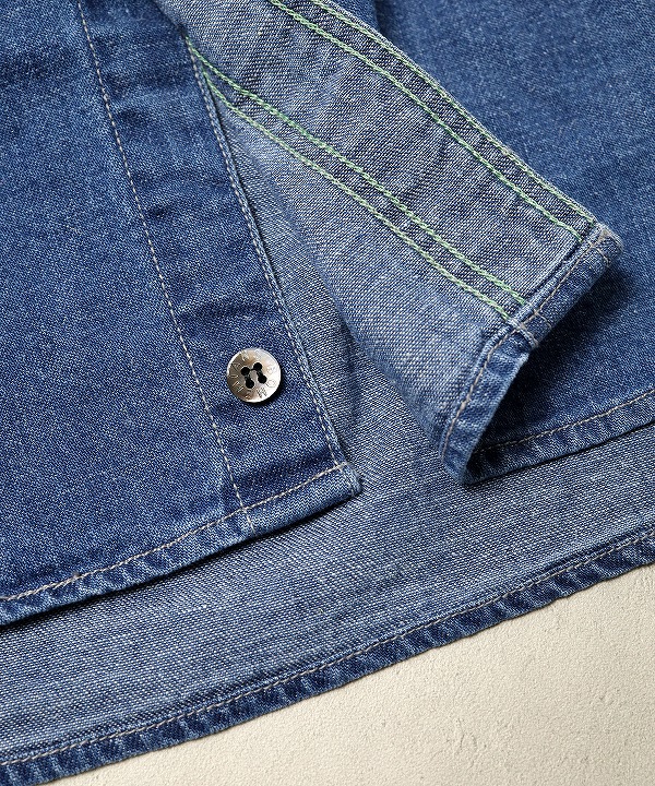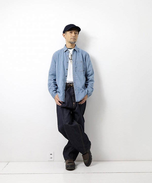 生地はコットン/ヘンプ混紡のオリジナルデニムを使用。ビンテージを想わせるドライな風合いで、軽くてやわらかい風合いが特徴です。