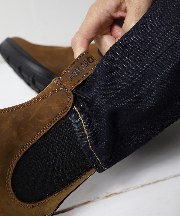 バッグループには「Blundstone」、フロントループには「Filson」と刻印されたレザープルループを採用。さらに、サイドゴアの内側やインソールには、Filsonを象徴するブレイズオレンジがあしらわれ、ブランドらしさを際立たせています。
