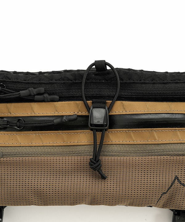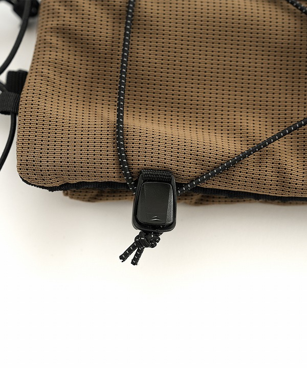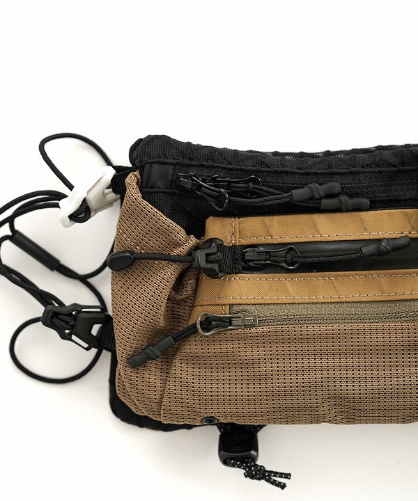 フロント側には4つの収納スペース(ジッパーポケット×3、オープンポケット×1)、バック側には2つの収納スペース(ジッパーポケット×1、オープンポケット×1)、さらにバック側にはウェアやポールを外付けできるストリングコードも備えます。