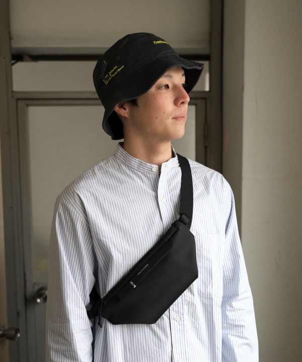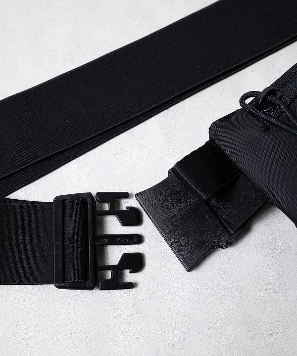 薄型ですので着用写真のようにアウターの中にも着用しやすく、伸縮するストラップがウエストポーチとしても活躍します。