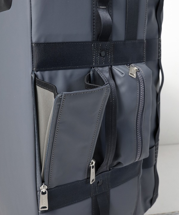 ラウンドZIP仕切りは3ヵ所のZIPポケットを、最下層の側面には細かい仕分けが可能な4ヵ所のZIPポケットを配しており、本体内部には軽量性と強度を備えた空洞芯とベルポーレン芯を組み合わせた補強をしております。