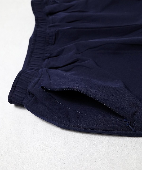 両サイドのポケット口にはデザインの邪魔をしないコンシールファスナーを配し、アクティビティ時の内包物の落下を防ぎます。