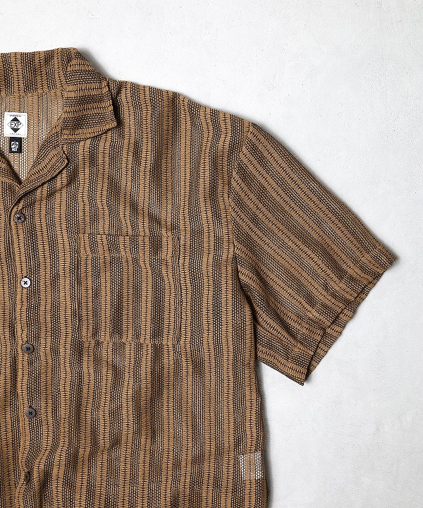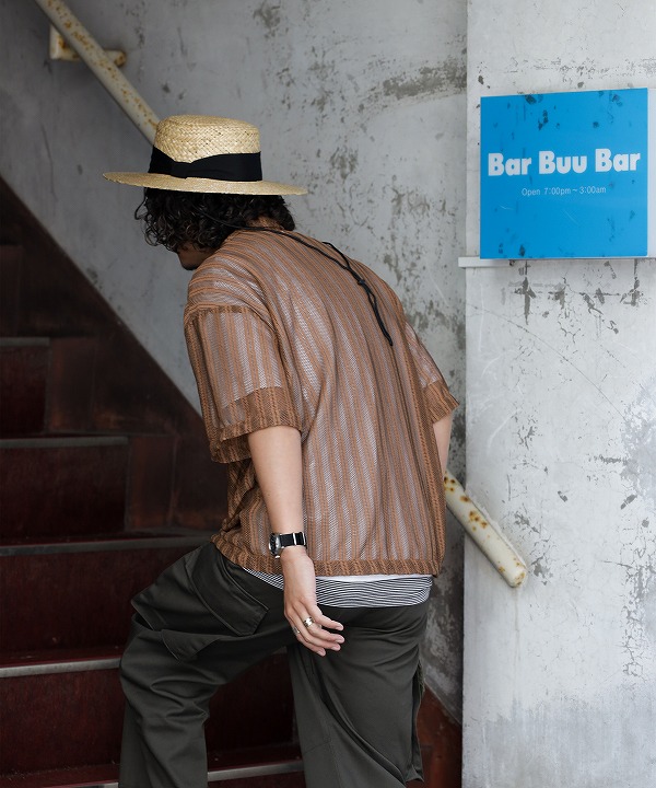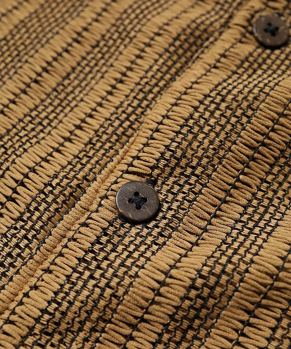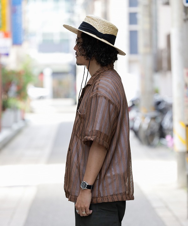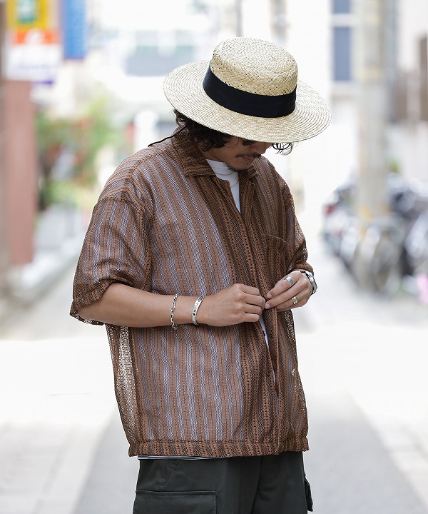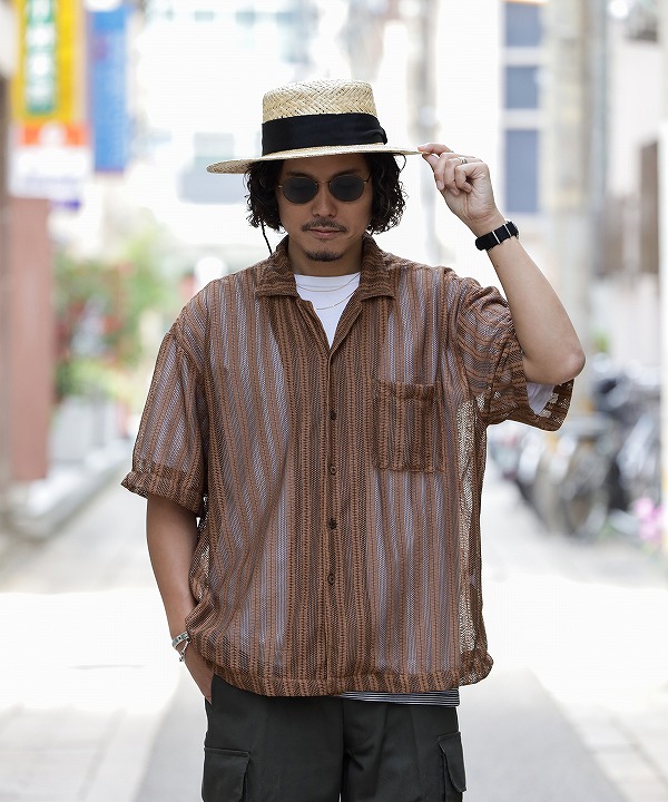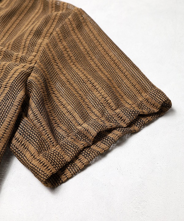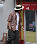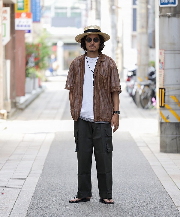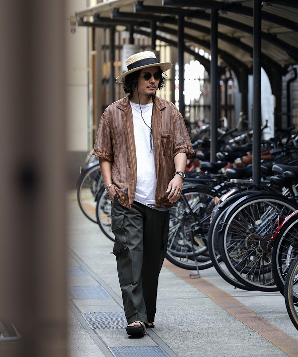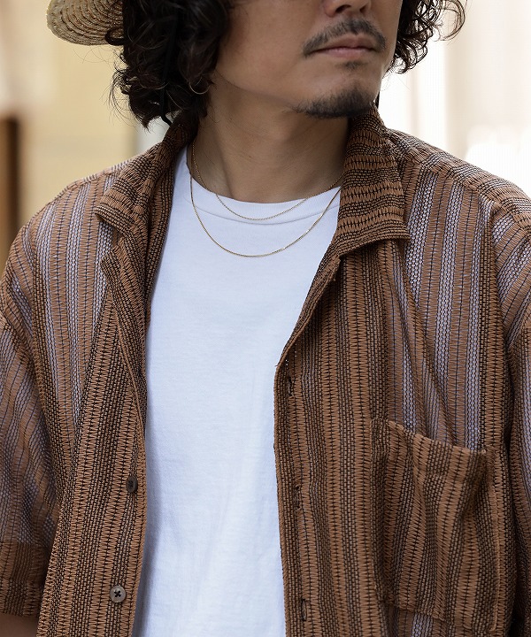 オープンカラーにぴったりのこの生地はインナーを写真のように薄い色にすると爽やかながら色気のあるスタイリングが完成します。