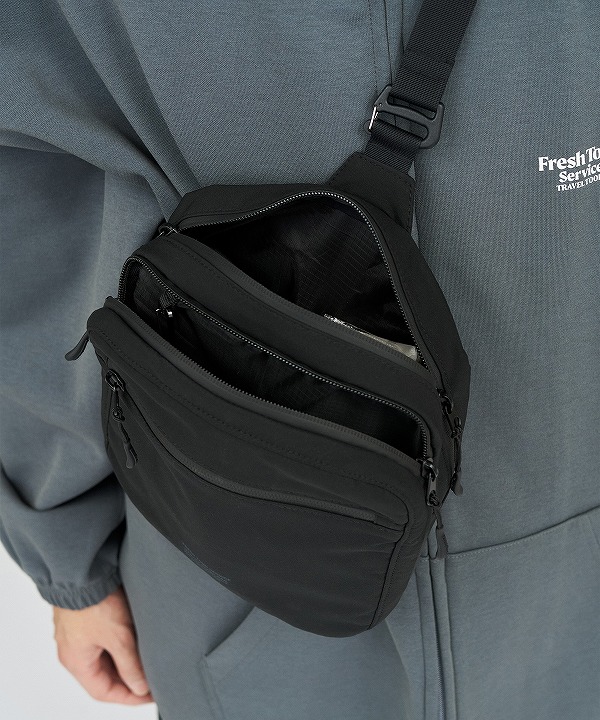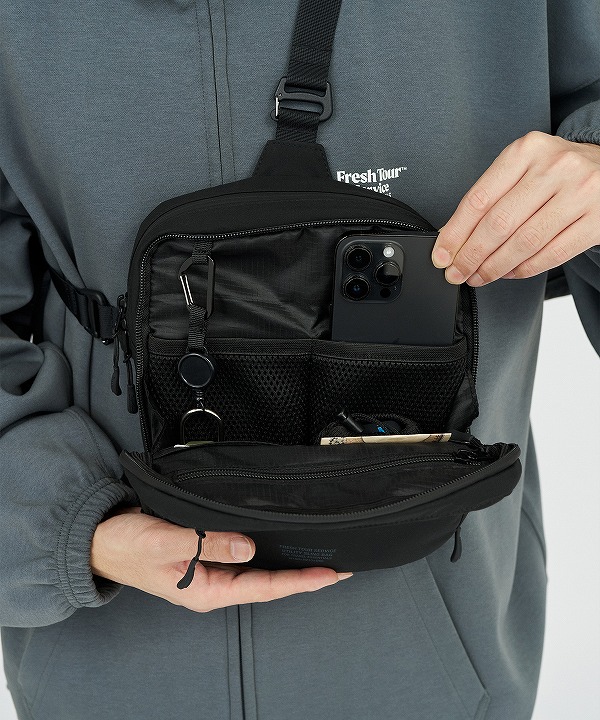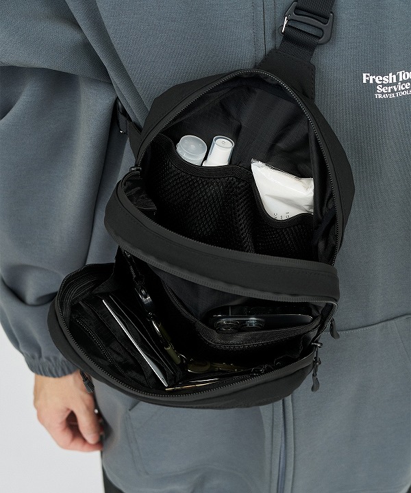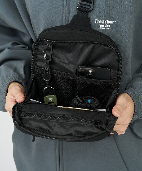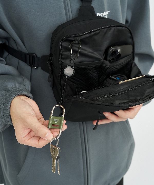 多機能なポケットを搭載したスリングバッグ。インナーとアウターの間に、身体にフィットするように縦と横のストラップで装着することで、盗難防止にも役に立ちます。パスポート、携帯電話、キー、財布の機能もあり、貴重品はすべて収納する事が可能。2つのメインポケットがあり、外側のポケットは大きく開いても操作しやすいところで止まるような設計に。