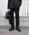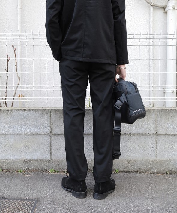 設計はテーラードジャケットとのセットアップを考え腰回りがすっきりしたテーパードシルエット。着用シーンの幅を想定して目立たないシームポケットと片玉縁のヒップポケットを配しました。