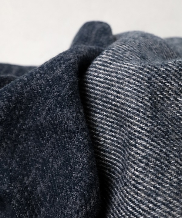 綿特有の重みが出ないよう空紡糸を使用、旧式の起毛機を使用してゆっくりと丁寧に起毛することでウールのような表情に仕上げました。