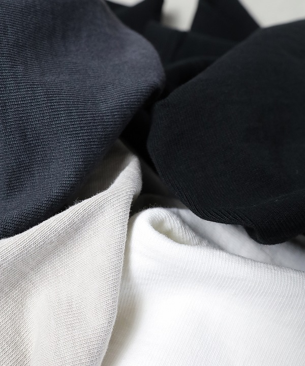 限界まで度目を詰めて編み立てるため着用と洗濯を繰り返しても縮みやゆがみが起こりにくいのが特長です。身生地に合わせスウエット並みのしっかりした厚みのリブを使用し全体のバランスを整えました。