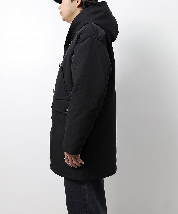 中綿入りで大ぶりのポケットとフードが付き座った状態でも手を保温できるハンドウォーマーといった悪天候観戦にも適したギミックを加えたアウターです。