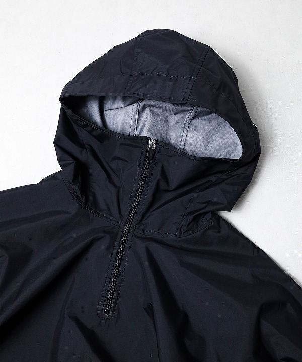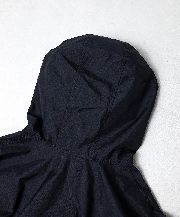縫い目を折伏せにし、雨の浸透を防ぎます。 ・フードのパターンを3枚にすることで、立体感的を出しフード内の空間を確保、また、縫い目を頭頂からずらすこと により雨の浸透を防ぎます。