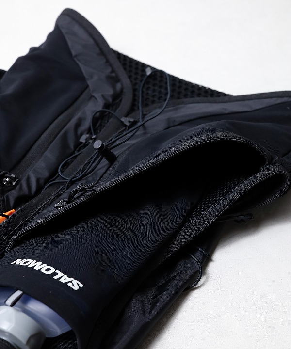 2 つの胸ポケットには 500ml の Salomon フラスクを収納できるため、喉が渇いたらサッと取り出して水分補給。