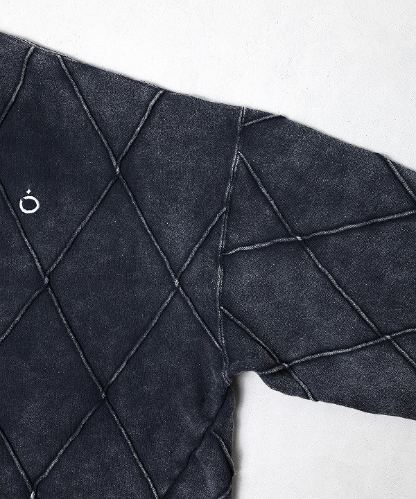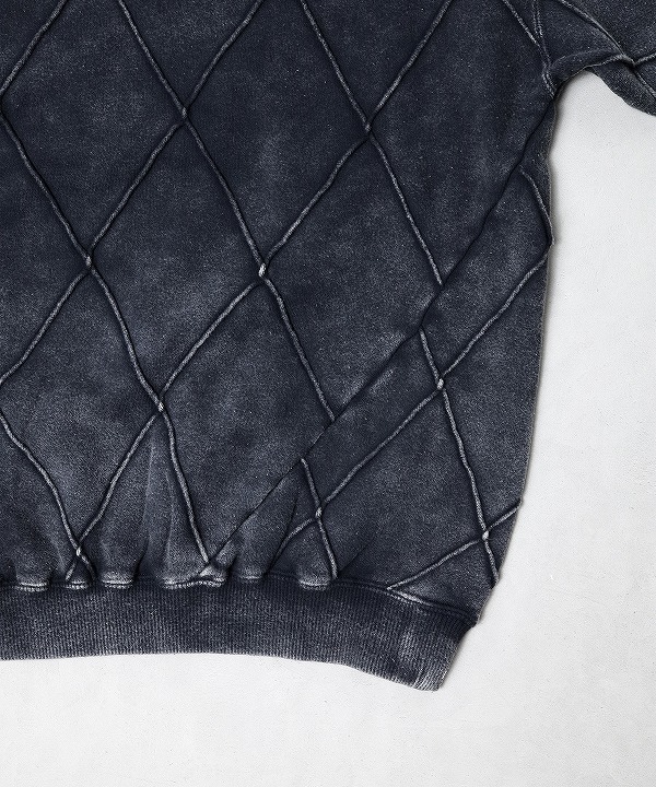 立体的にダイヤモンド柄を全体に施し、手作業で染めの工程、洗いを施し濃淡のある独特なヴィンテージ感に仕上げてあります。