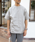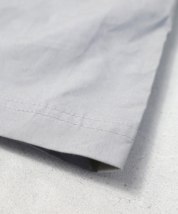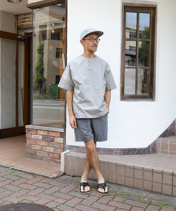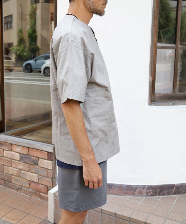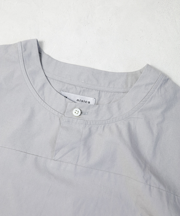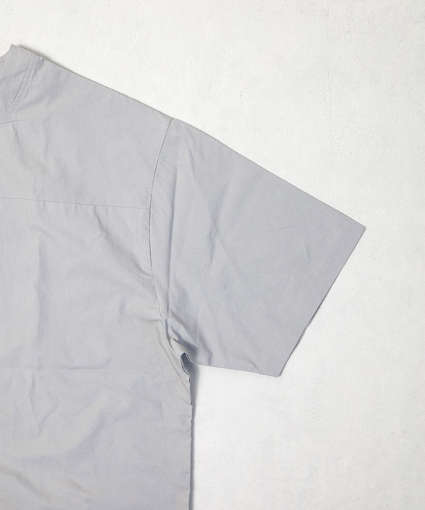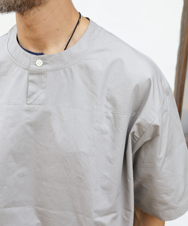 クルーネックに1つボタンの襟元。目の細かいサラリとしたシャツ生地をTシャツ型に落とし込んでいます。