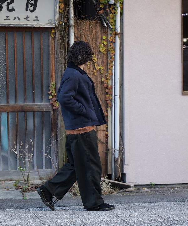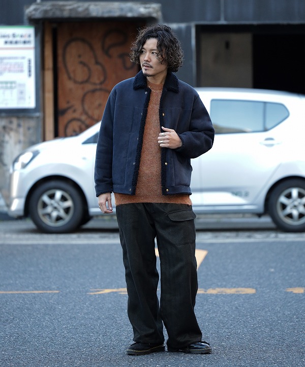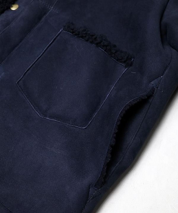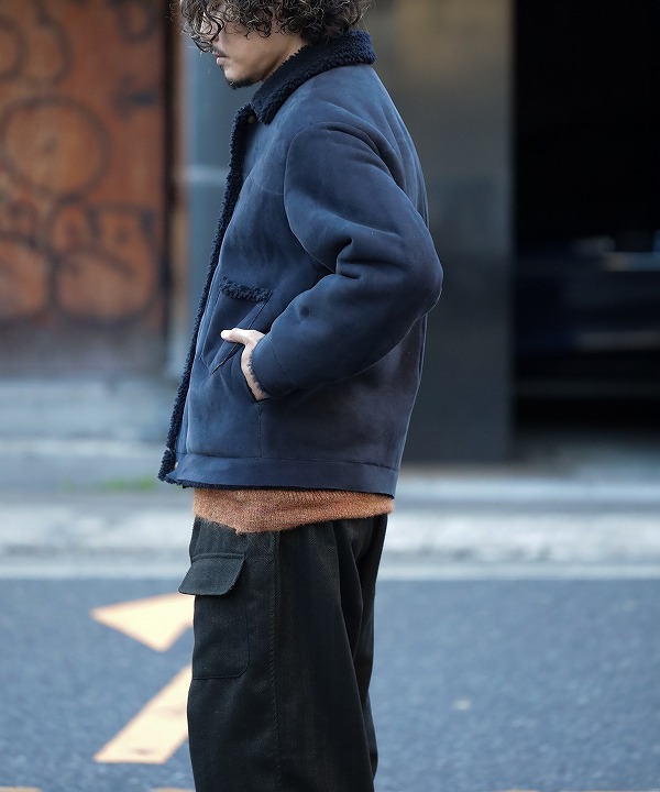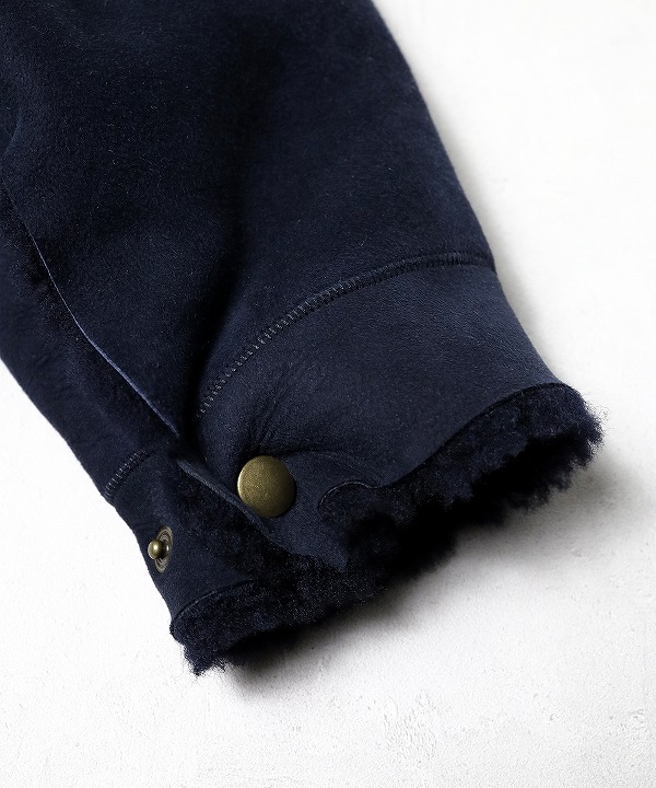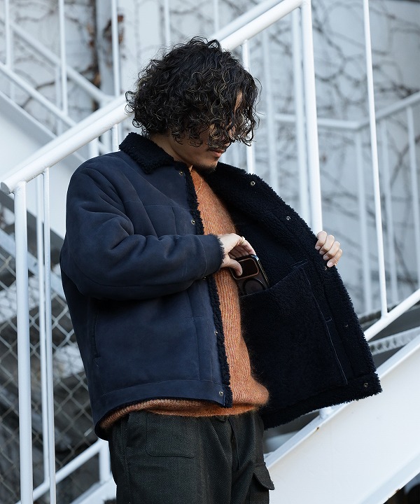 寒い冬場にさっと羽織れて、室内ではさっと脱げるように着脱がスムーズなドットボタンを配し、脇線利用のポケットに手を入れ込むと悴んだ手をボアが優しく包み込んでくれます。