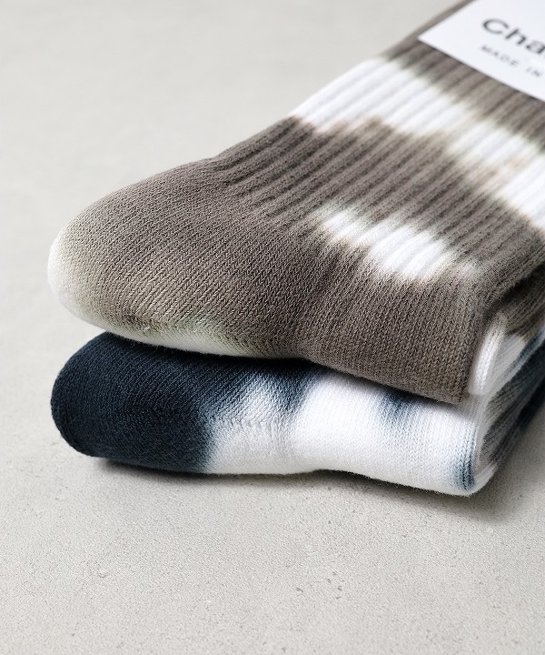 フィット感を増すために、脛から足首に向かってテーパードさせて編み立てたソックスです。