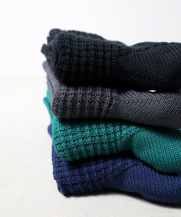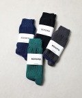 時間と効率が最優先される現代の靴下づくりの流れに反し、あえてコンピュータ化されていない旧式の編み機を使い、古き良きオーセンティックな肉厚のワッフル素材をイメージして編み立てたソックス。ボディに対し、足底部分は履き心地を優先してプレーンな編み地に。程よい厚みのあるソックスなので、シューズや季節を問わず、一年を通じて活躍してくれる一足です。