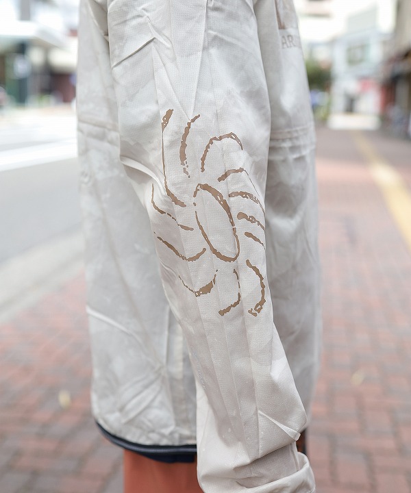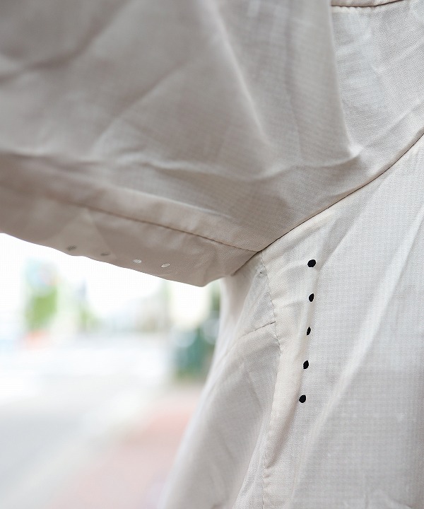 抜群の通気性と高い撥水性を持つ生地を使用しており、山中の霧や軽い雨の中でも快適に過ごすことができます。脇部分に細かい通気孔を開けているため蒸し暑くなることもありません。