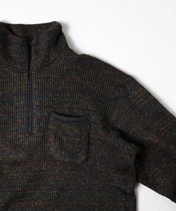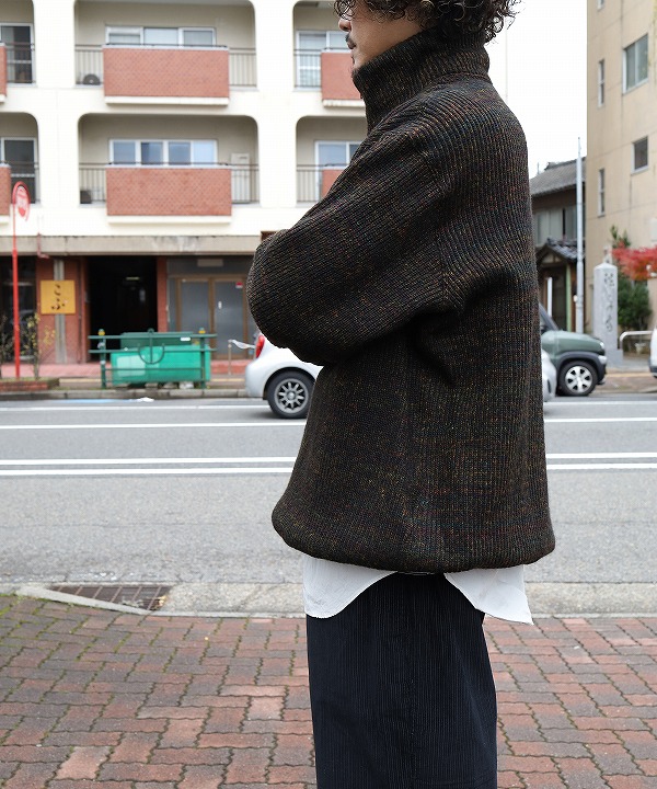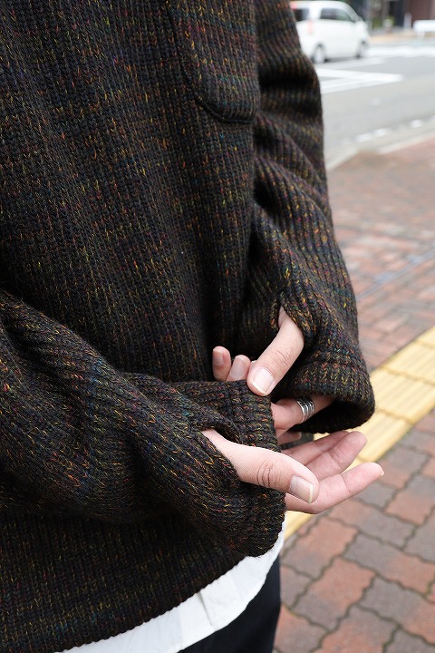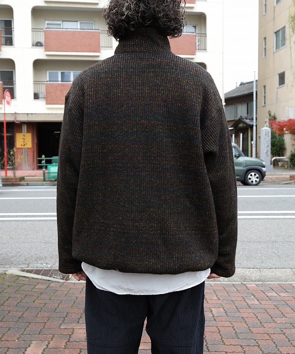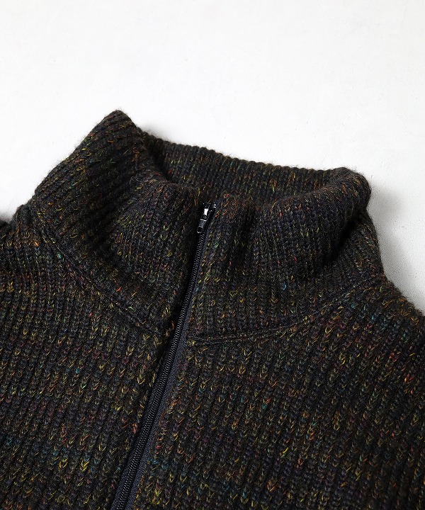 ウール/ポリエステルを混紡した風合い豊かなミックスカラーのニット素材を使用。肉厚でとても暖か、それでいて軽く滑らかな肌当たりが特徴で冬に快適に過ごせる一着に仕上がっています。
