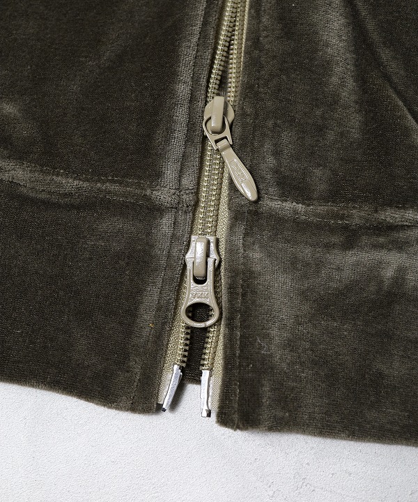 ソフトな発色と艶感のあるベロア特有のラグジュアリーな雰囲気が特徴的な一着です。首元はリブカラー仕様となっており、すっきりとしたスタイリッシュなイメージが強調されています。