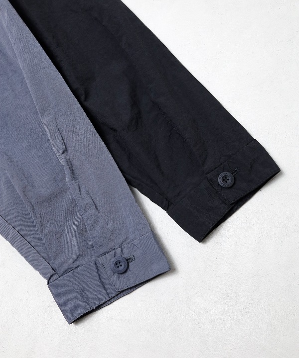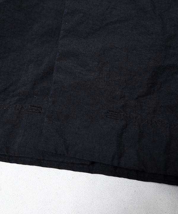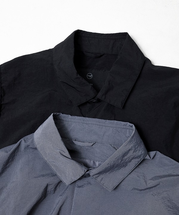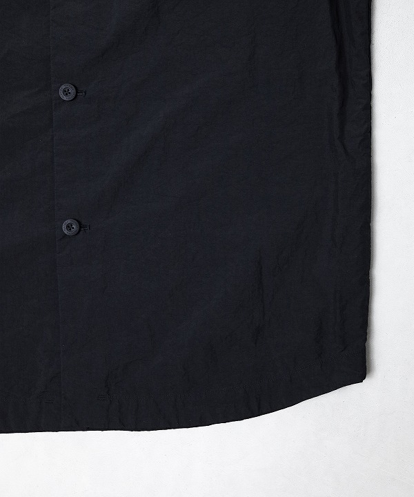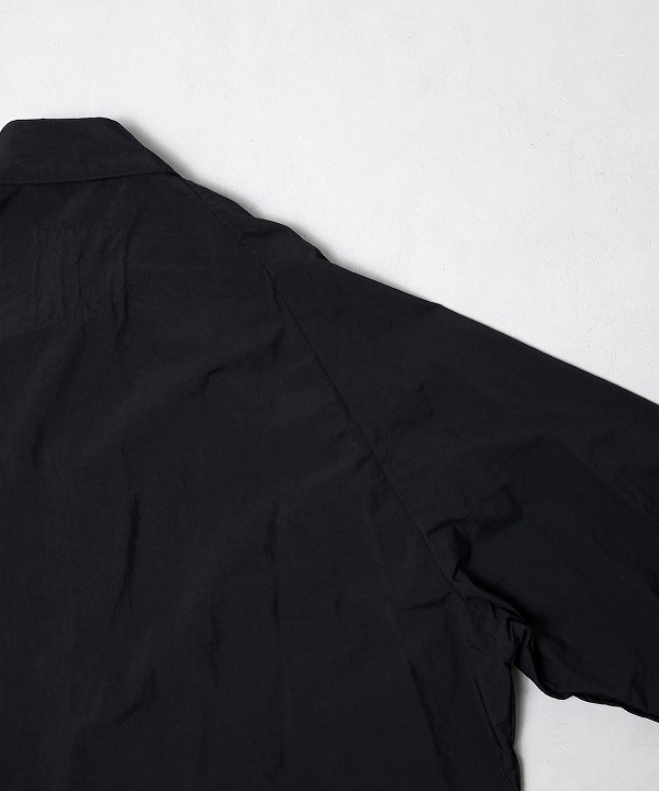 小ぶりの襟に短めのカフス、オーバーサイズシルエット、 計算されたバランス感や仕様ながらステッチを表に出さずポケットを排除するなど極めてミニマルな佇まいに仕上がりに。