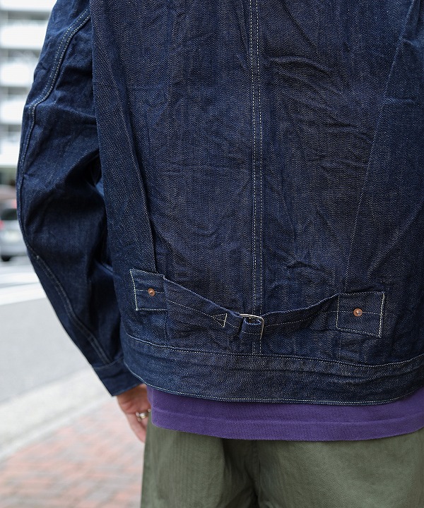 身巾にゆとりを持たせたシルエットで、後ろ身頃は中心接ぎのあるスプリットバック仕様で真鍮製の2本針バックルが付きます。フロントの見返しにはセルビッチを使用。