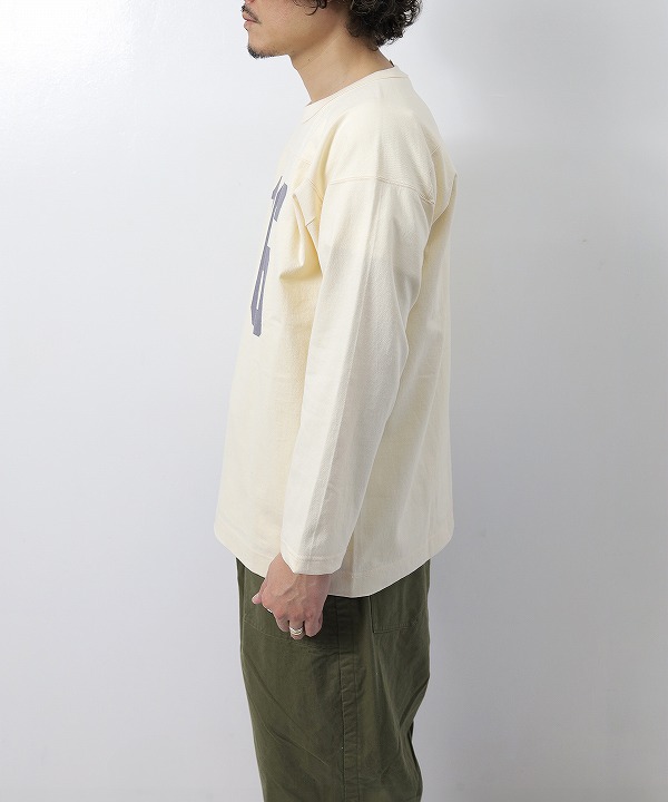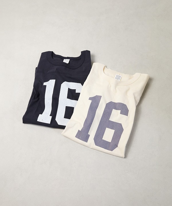 やや太番手にあたる14番の空紡糸を使ったオリジナルの丸胴ボディーのフットボールTシャツです。