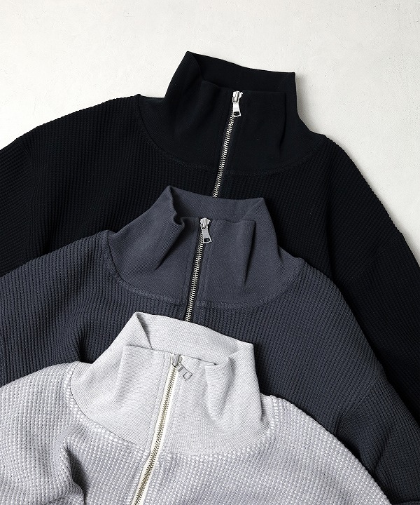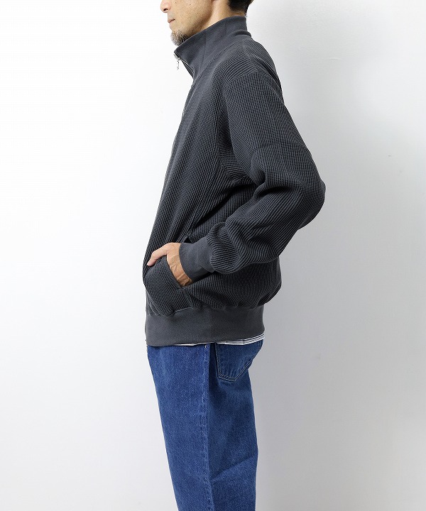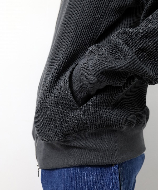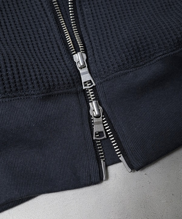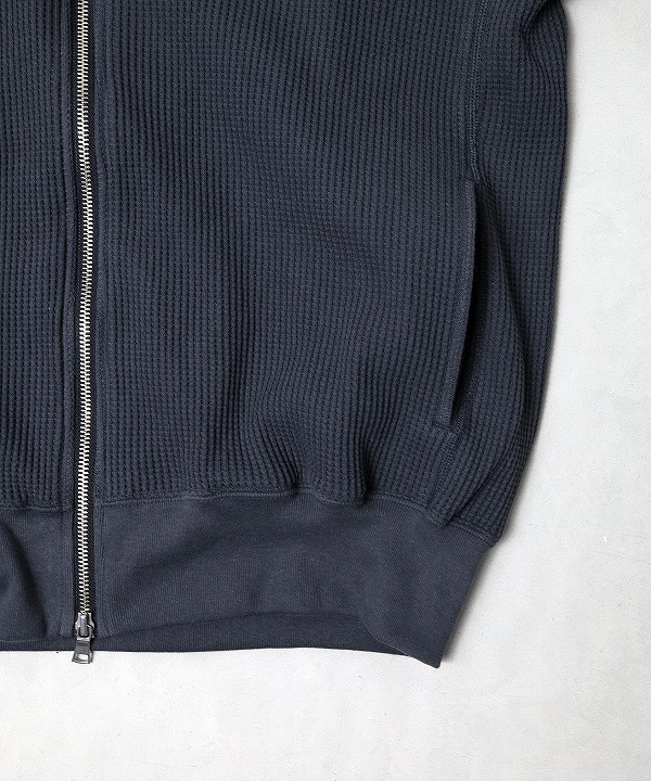 旧い編み立て機を使用して編み上げた肉厚のローゲージワッフル地を使ったフルジップ仕様のカーディガンです。