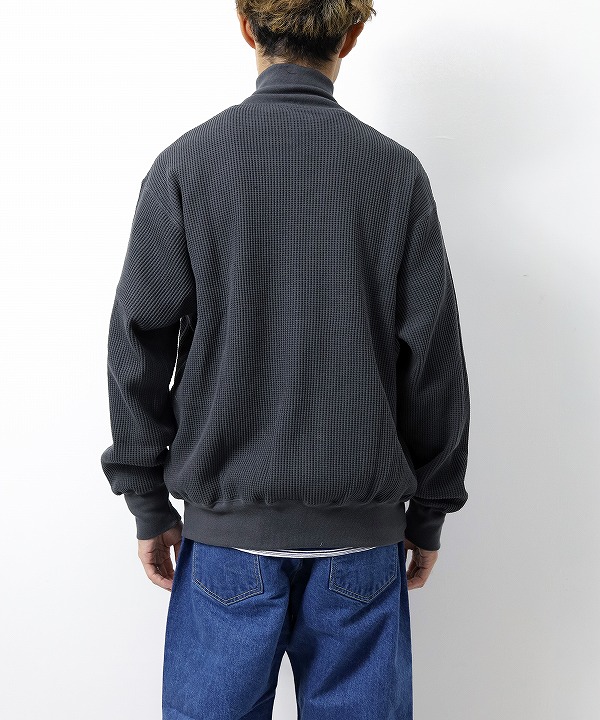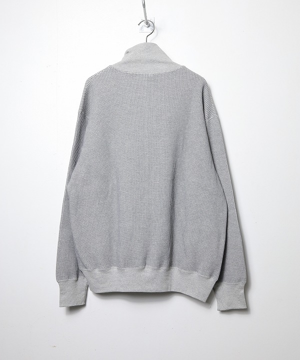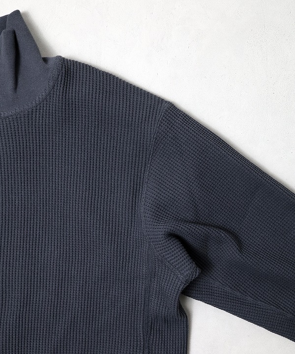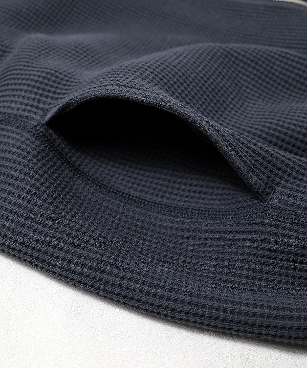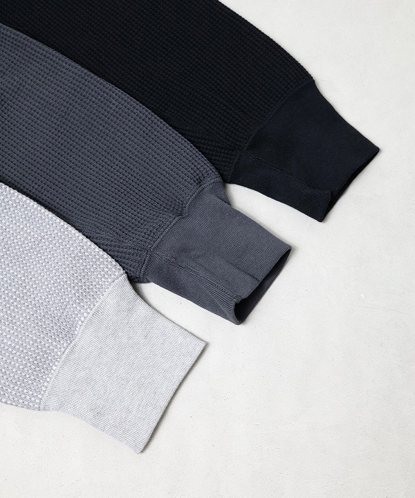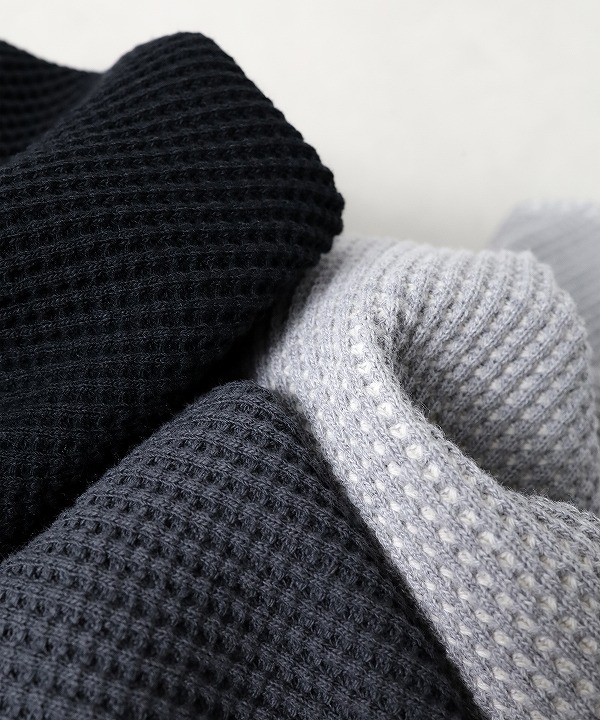 20/-のUSコットンを引き揃え、昨年のモノよりさらに10%度詰めで編み立てる事で通常伸びやすいワッフルのマイナス面を軽減しています。