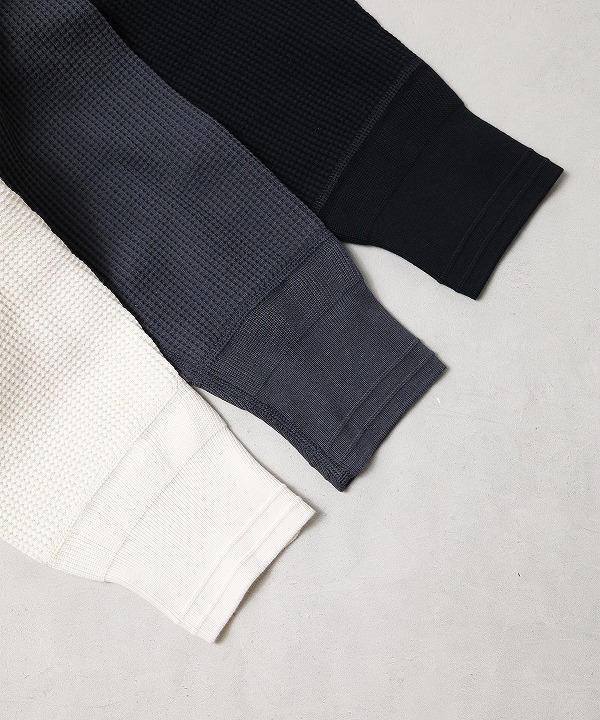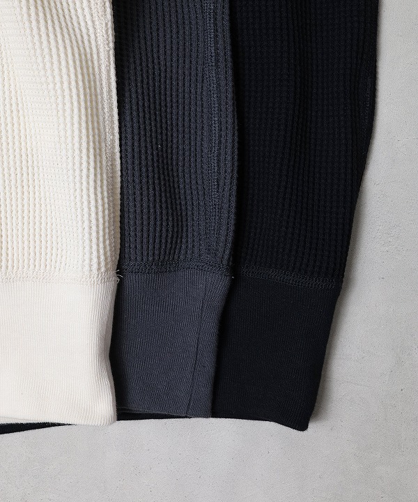 USコットンを引き揃え、以前のワッフルよりさらに度詰めで編み立てることで、通常伸びやすいワッフルのマイナス面を軽減しています。