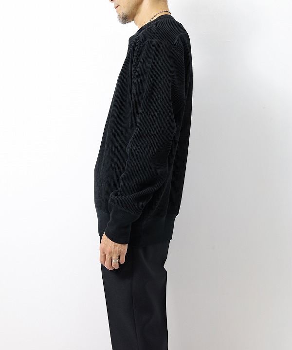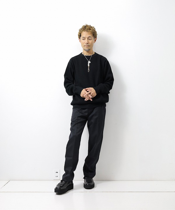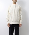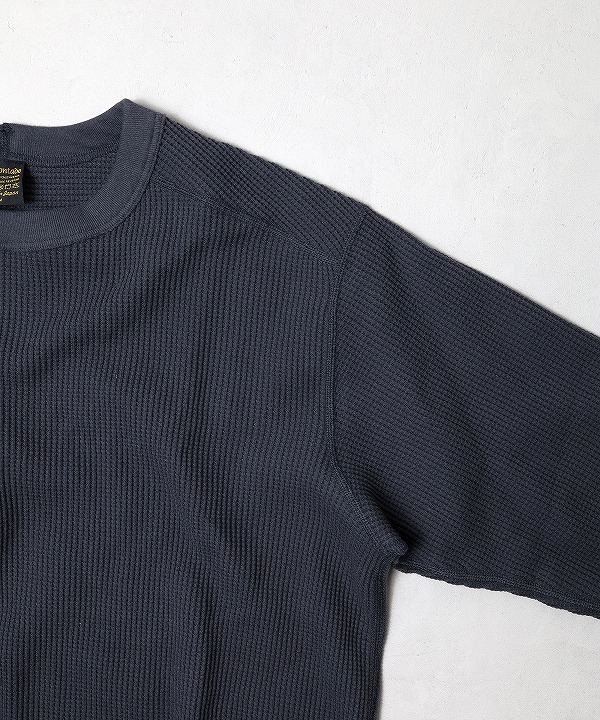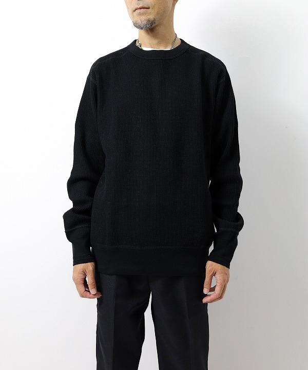 古い編み立て機を使用して編み上げた、肉厚のローゲージワッフル地を使ったクルーネックです。