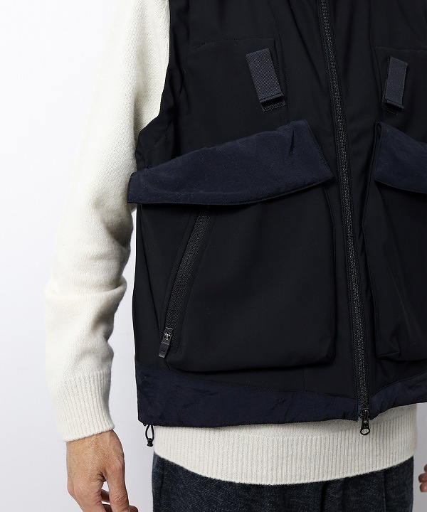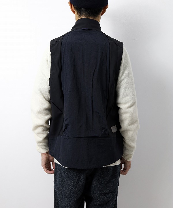 撥水・透湿・保温・防風・ストレッチとマルチファンクションを有するナイロン/ポリウレタンの 混紡素材を使用したパッカブルベスト。