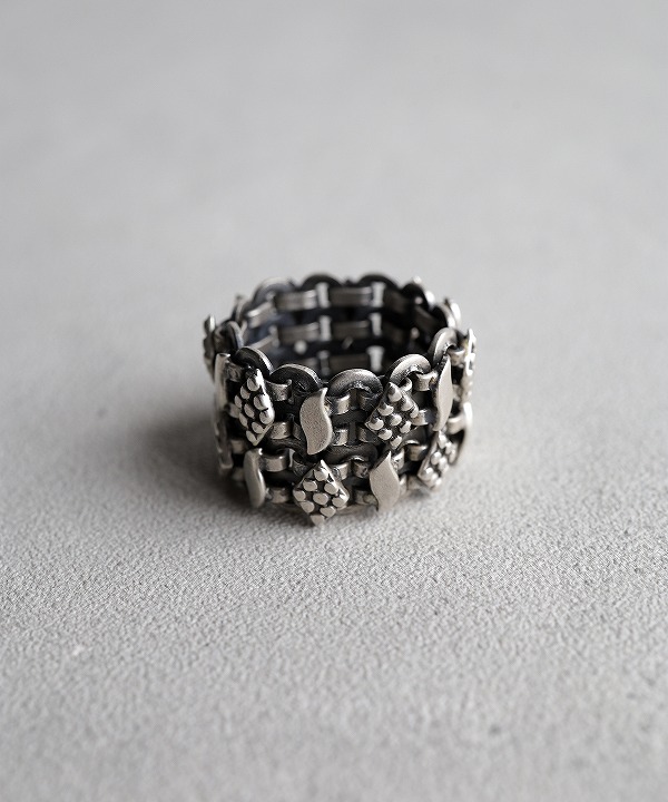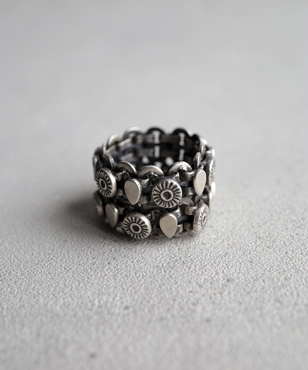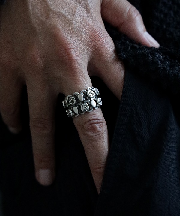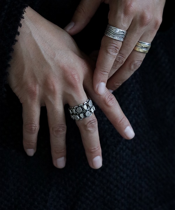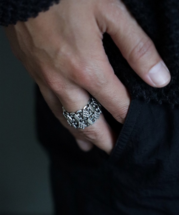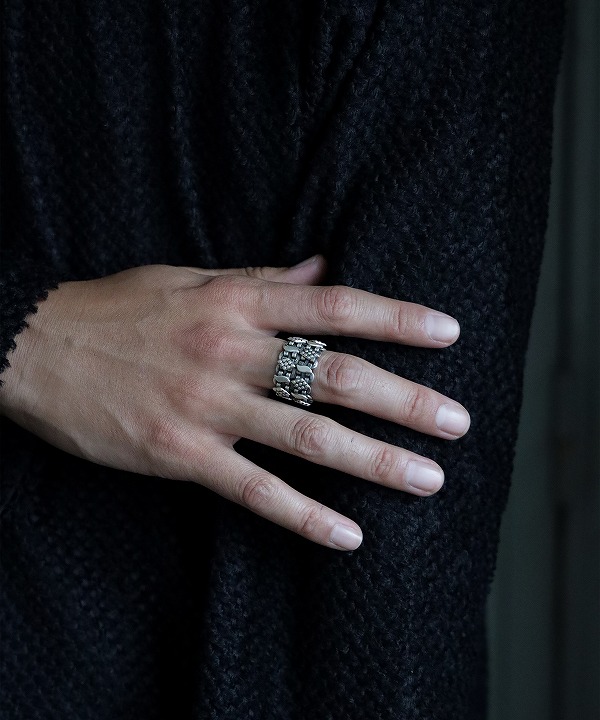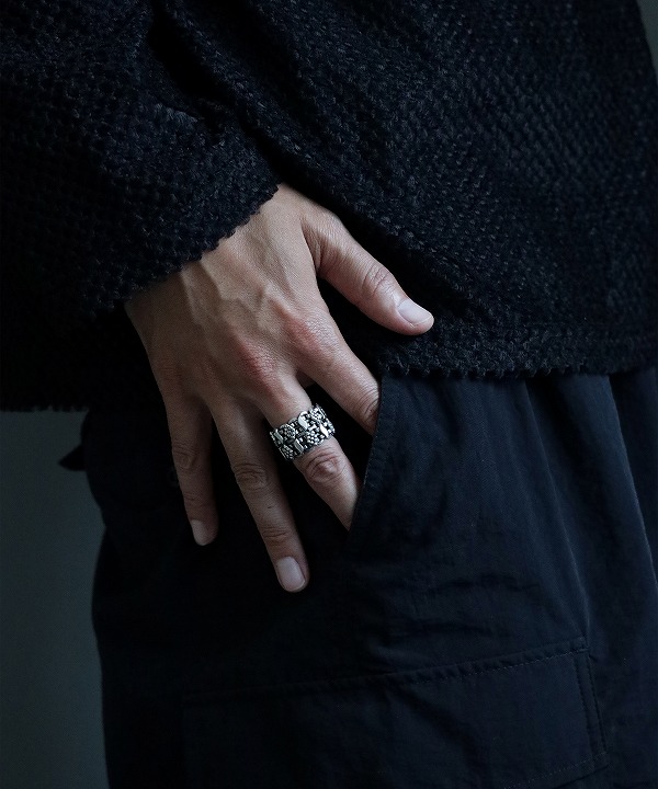 シルバー925素材を使用し、手作りで一点一点丁寧に制作されたダブルリング。他で見ることはない特徴的なデザインが独特な雰囲気をまとっていて、スタイリングを引き立ててくれます。