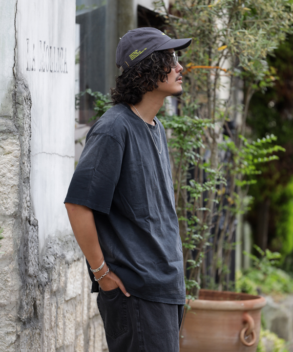mooji moojiは1980年創業のLA, Down Townの縫製工場が、2020年 7月4日アメリカ独立 記念日からスタートした、すべてを与えてくれる地球や人々への「LOVE」をコンセプトに表現 されているファッションブランドです。デザイナーは Gary Kenji Kim。 彼はmooji moojiのスタート前 主にデニムブランドの生産、デザイン、クリエーティブディレクタ ーを務めており、その当時からユーズドデニムのような色落ち、日焼けをしたカットソーにも興味を もっていました。 製品の縫製から加工まで一貫して自社工場内で行っています。特に加工は1点1点を3-5人の熟練 した職人が行っており、大量生産には出せない手作り感とリアルな古着感にこだわって生産しています。