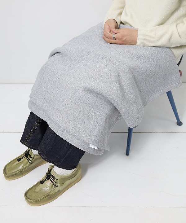 大判サイズのスウェットブランケットです。スウェットシャツで使用されている7.8オンスのコットン/ポリエステル生地を使用。裏起毛で柔らかく暖かくお部屋でのリラックスタイムにひざ掛けとしてお使いいただけます。洗えるのでキャンプ使いや車中泊など野外での使用も良さそう。