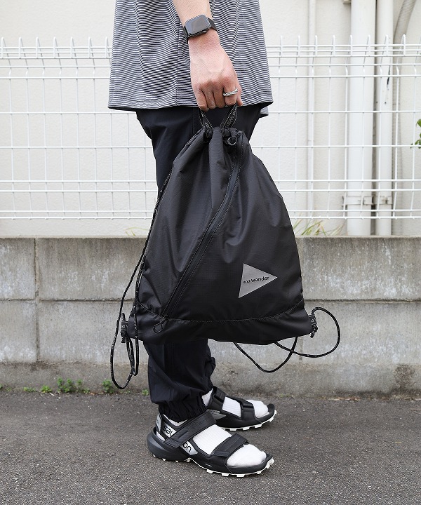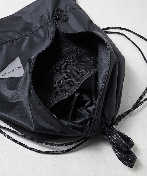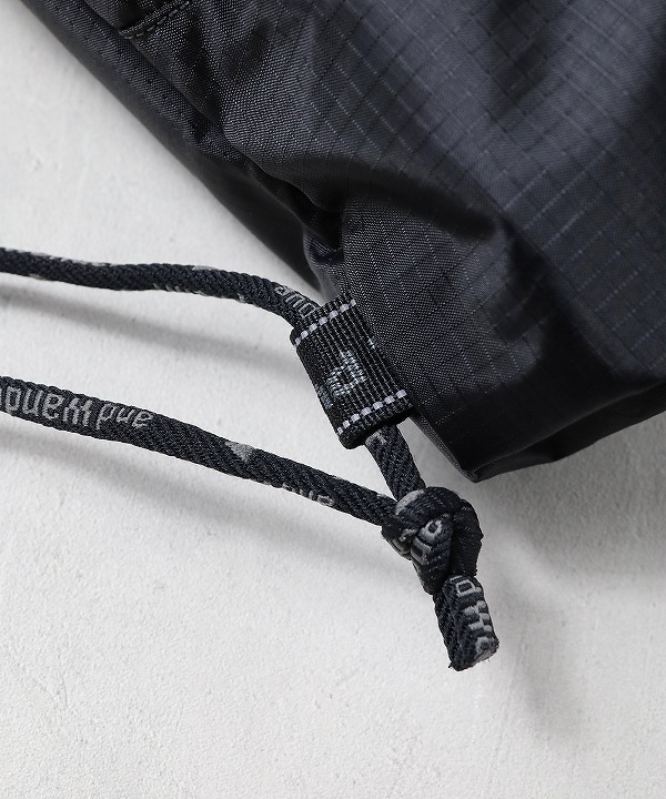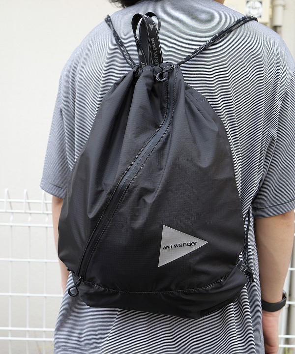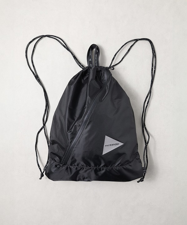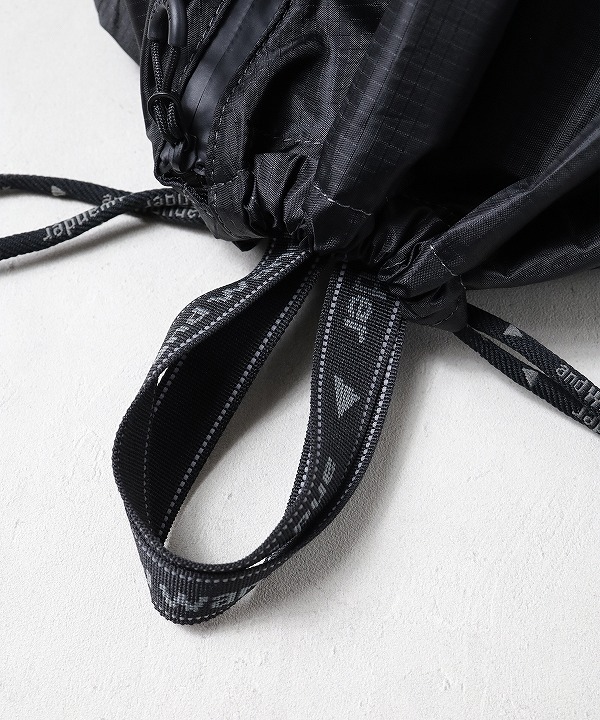 軽量のポリエステルリップ素材を使用したドローストリングバッグ。