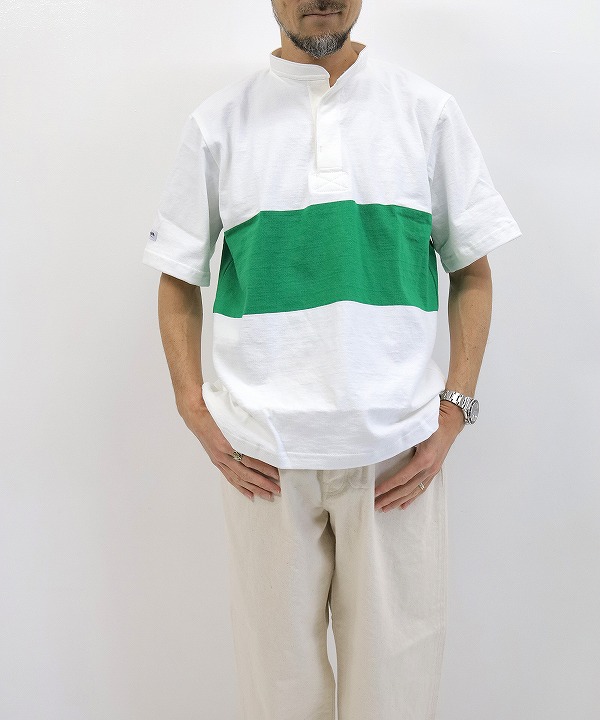 シルエットはこぎれいにスッとおさまるおなじみの型。襟元はヘンリーで仕上げた軽快な一着です。