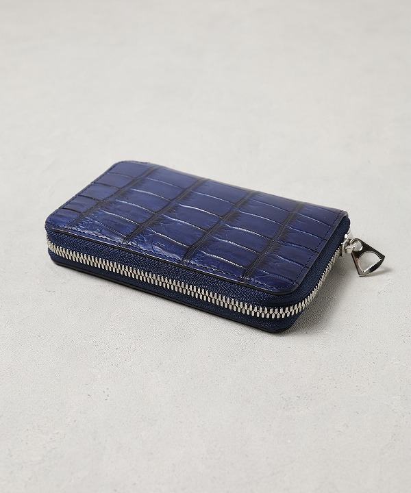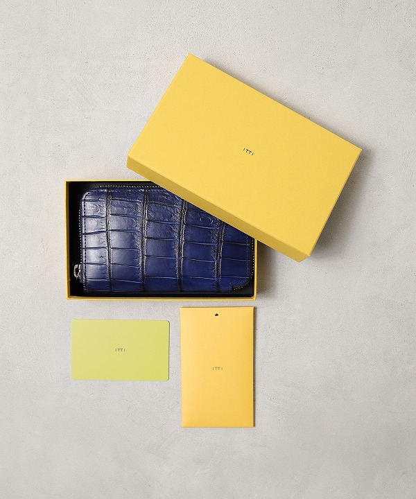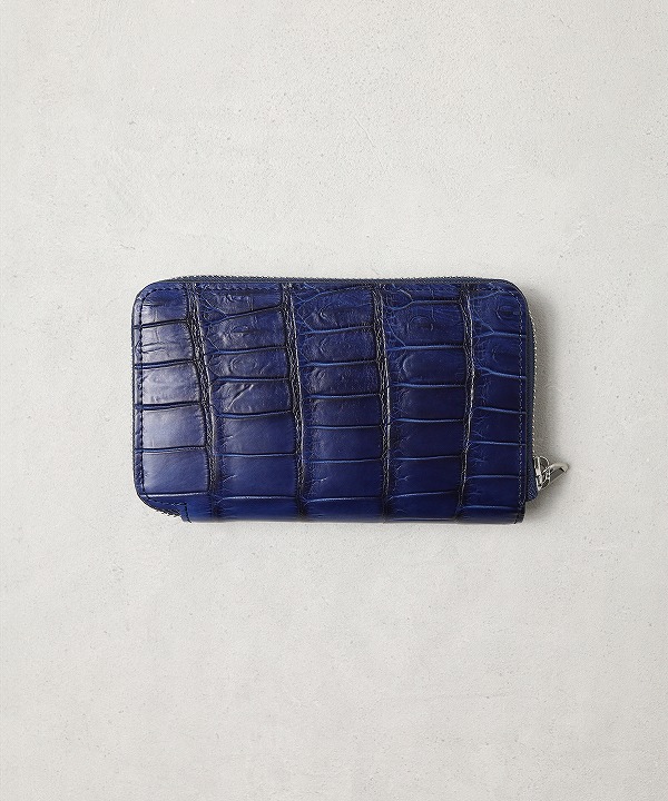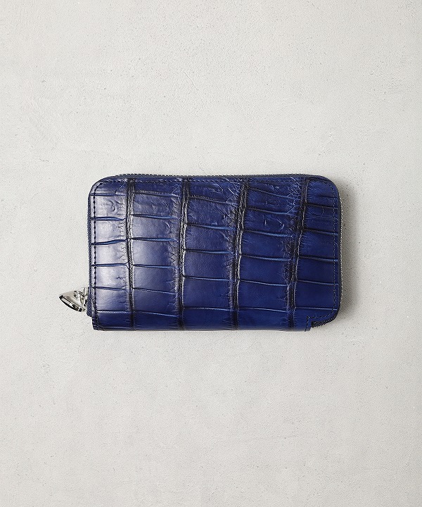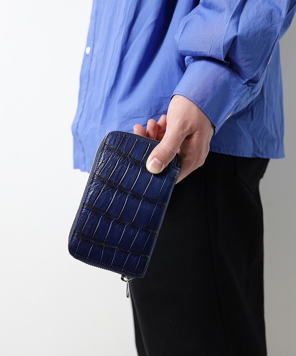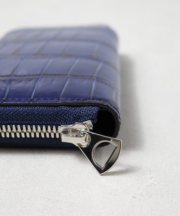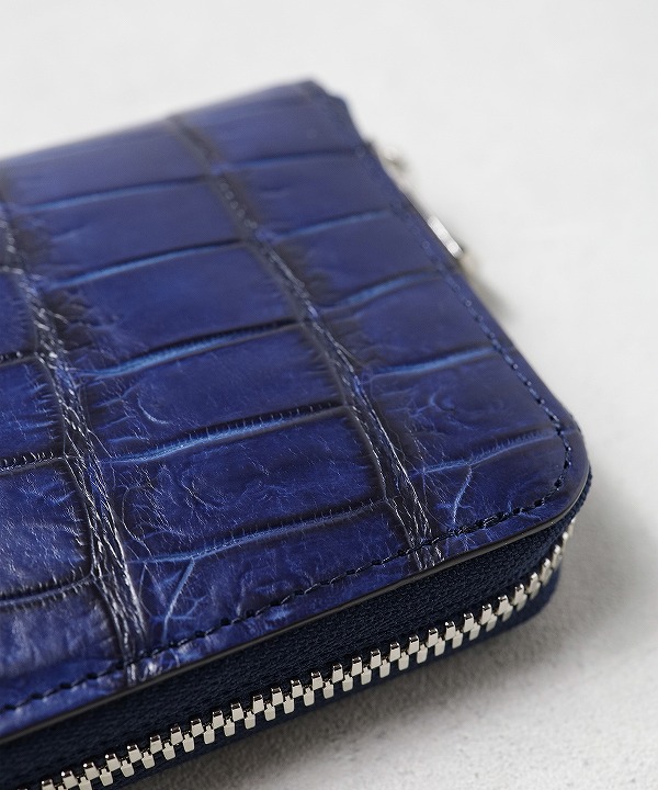 メゾンと提携し高品質なエキゾチックレザーを供給する仏 HCP社の下地を使用し、国内で仕上げたクロコダイルレザー、“AI CROCO(アイクロコ)”。最高品質として名高い徳島県の藍を使用し、一枚一枚手染めで仕上げています。いわゆる贅沢取りで裁断はせず、あくまでクロコダイルの全体の雰囲気や空気感を感じられるよう端から端まで余さず取り切るため、使用シーンを想像しながら、デザイナー自ら裁断を行なっています。