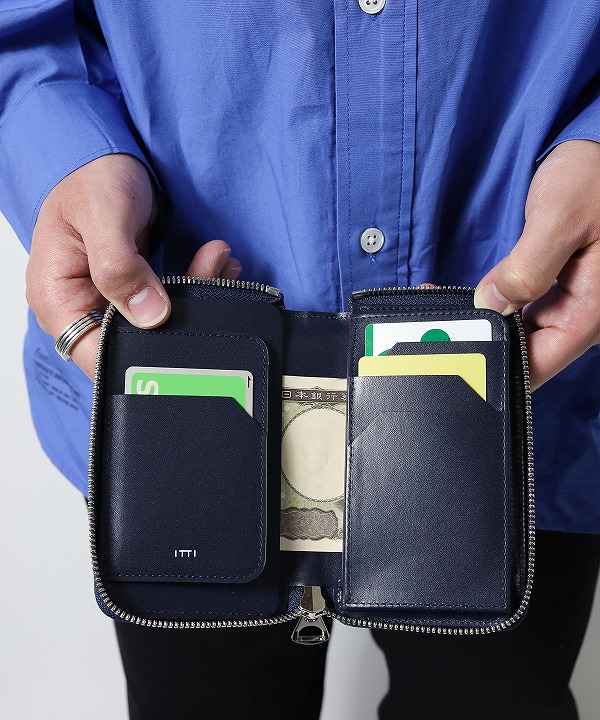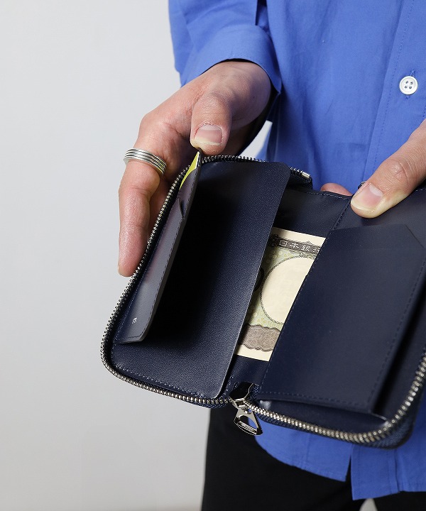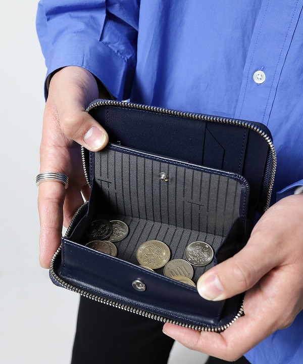 二つ折りでラウンドファスナー仕様となっており、見た目に反して驚くほどの収納力を誇ります。ボックス型のコインポケットや、11枚分入るカードポケット、さらに2つのフリーポケットなどが備わっています。