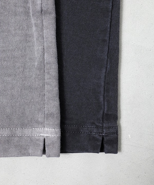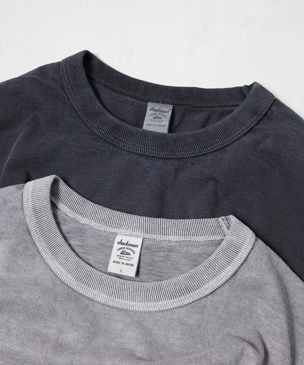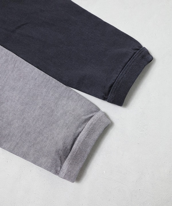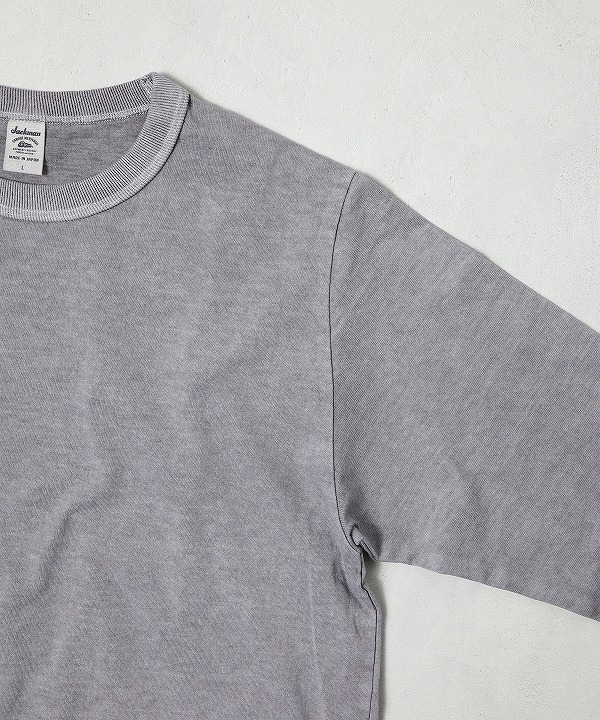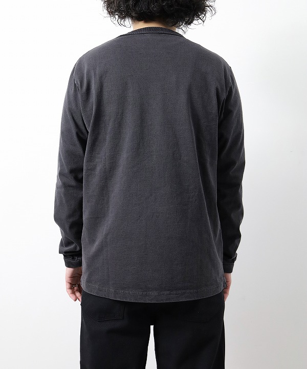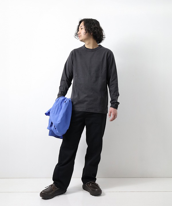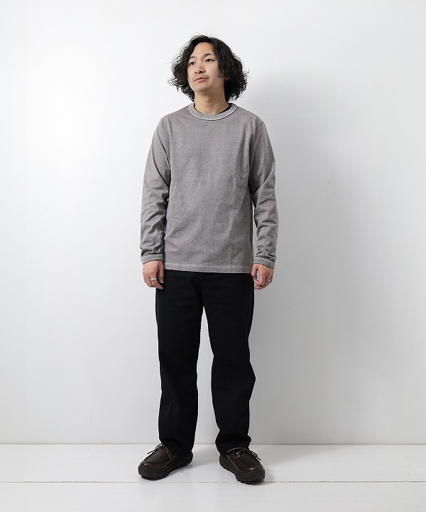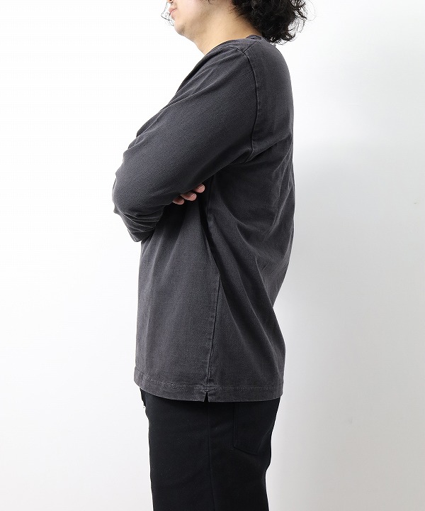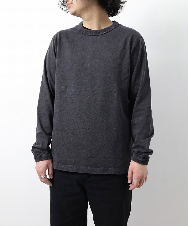 乾燥感がありザラッとした肌触りが特徴のアメリカ綿を空気紡績によって粗野な表面感に仕上げた長袖Tシャツ。ピグメント染めを施しヴィンテージ感のある雰囲気に仕上げてあります。