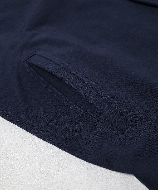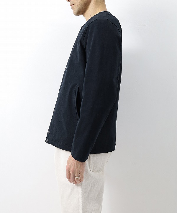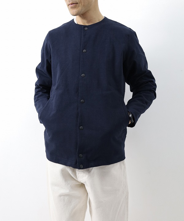 伸縮性の高いポリウレタン糸を綿糸でカバーリングした糸を高密度で編立てた素材を使用したカラーレスジャケットです。