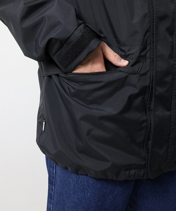 比翼仕立てのフロントはダブルジップで実用的。さらにフラップ付きのスナップボタンとの二重開閉で、ジップが隠れる仕様ですので風の侵入をシャットアウト。さらにシークレットポケット付きなのも嬉しいです。
