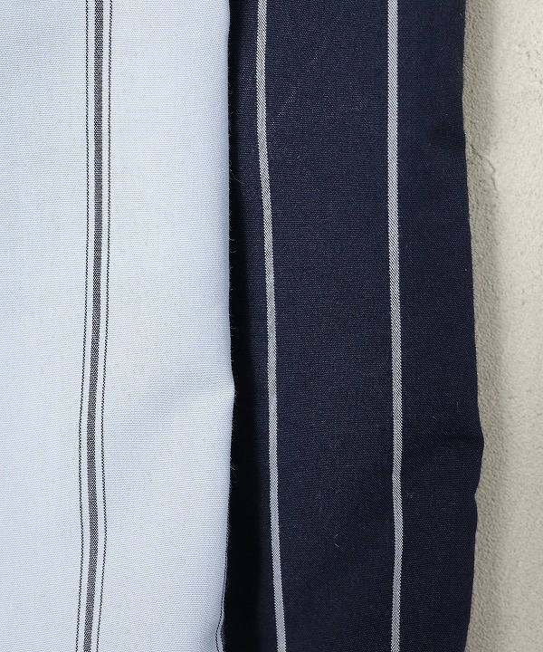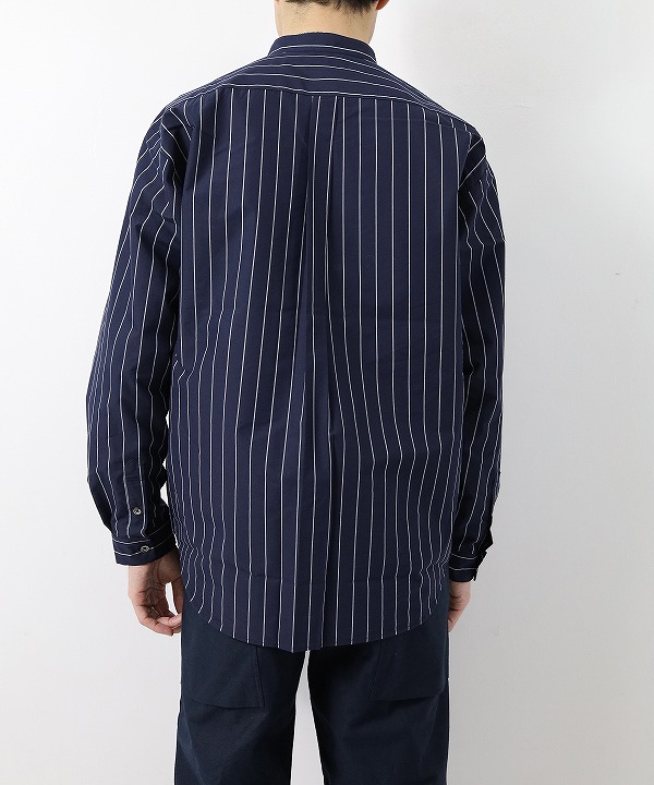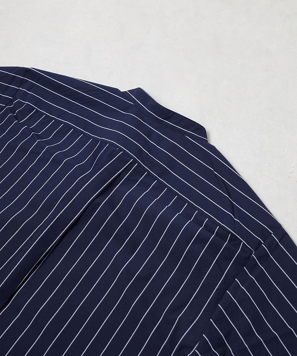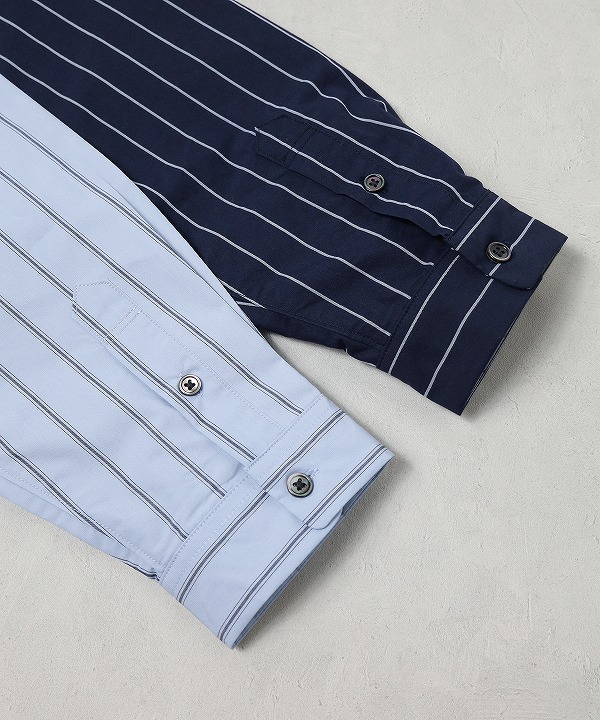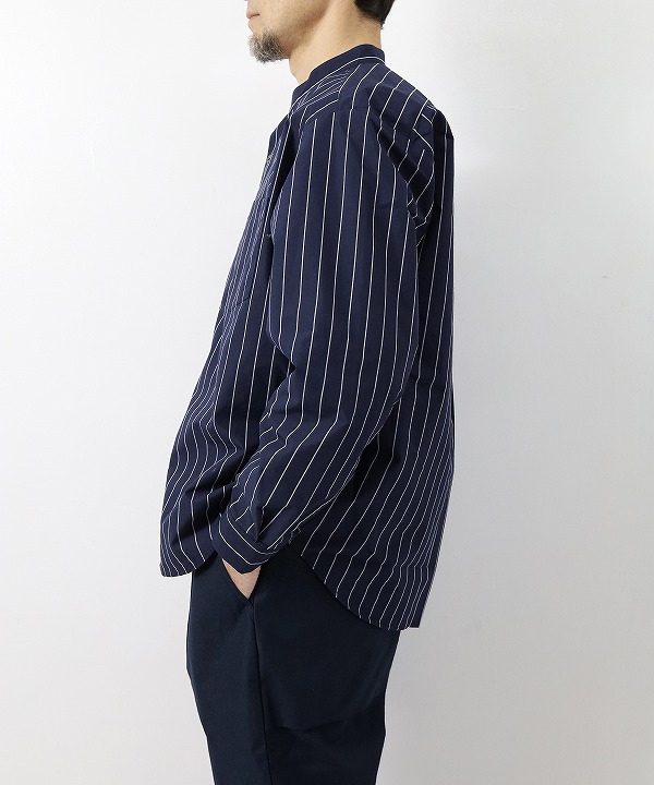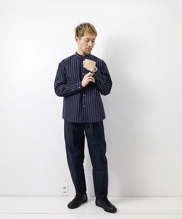 機能性を持たせた綿ポリエステルのタイプライター生地を使用したバンドカラーのワイドシャツ。