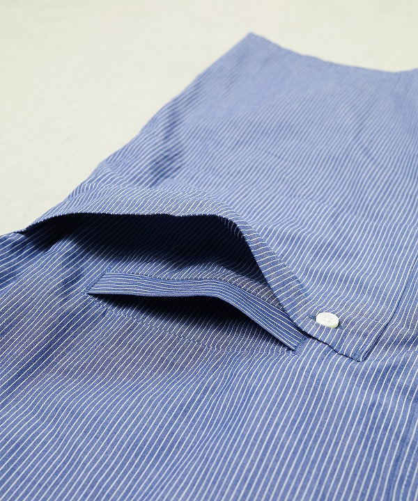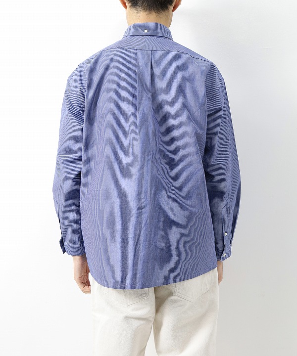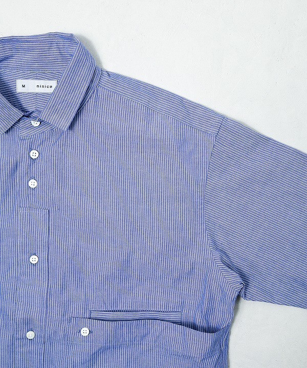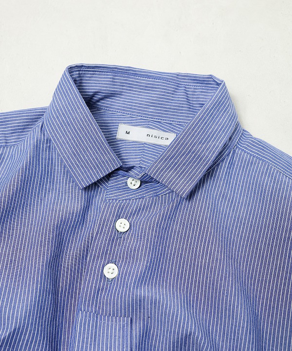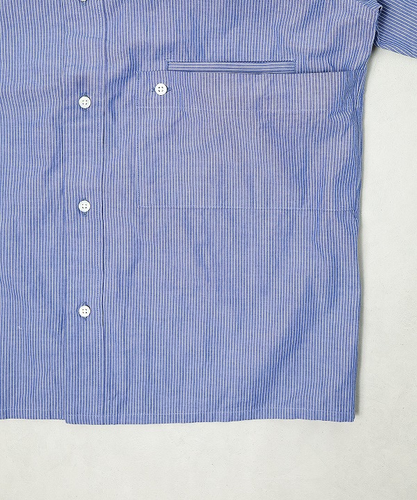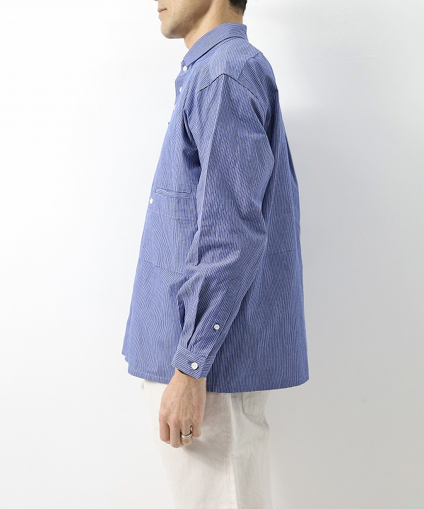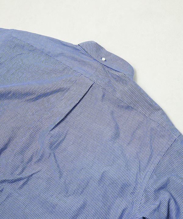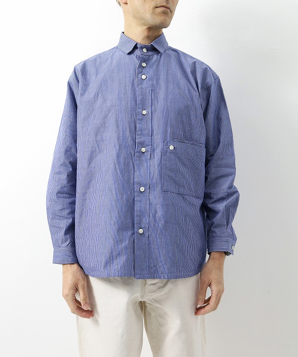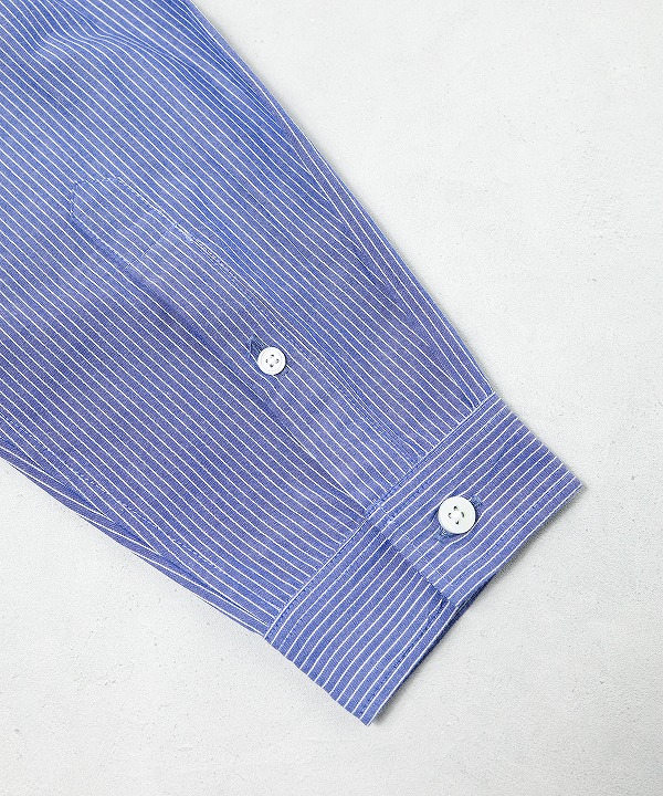 サラリとした肌触りの良いコットン100%生地を使用。ブルーを基調とした細かいピッチのストライプ柄がカジュアルなシャツでありながら品の良さも感じさせます。