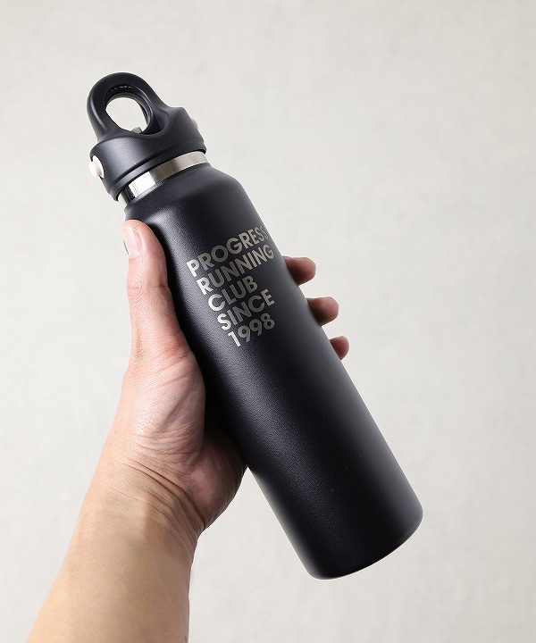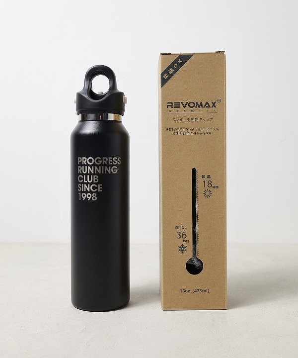 PROGRESS RUNNING CLUBとアメリカ・ポートランド発REVOMAXのコラボボトルは、80-90年代ランニングカルチャーの雰囲気と、片手で瞬時に開閉できる高い機能性(炭酸・保温・保冷)を融合したスタイリッシュな真空断熱ボトルです。