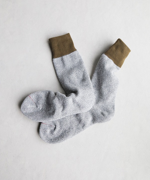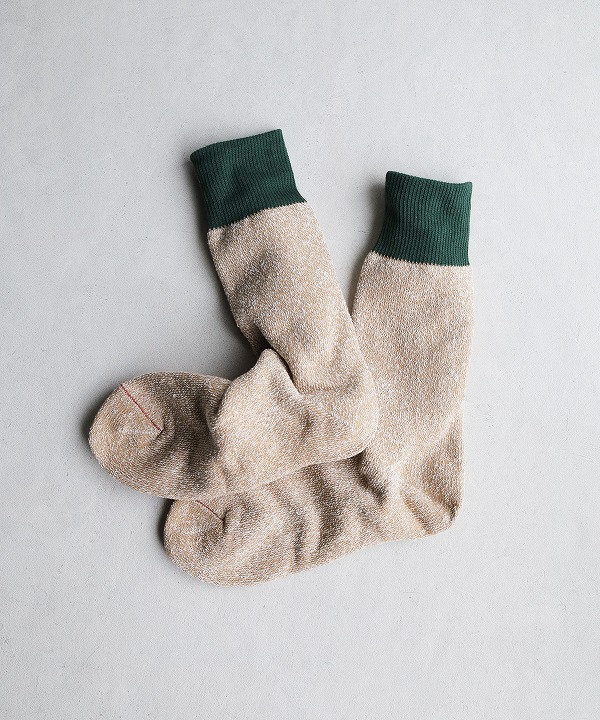 希少な特殊編み機を使用し、熟練の職人の手で丁寧に編み立てたダブルフェイス仕様のソックスは、表側の色糸にコットン、内側には未染色のシルクをふんだんに使用。