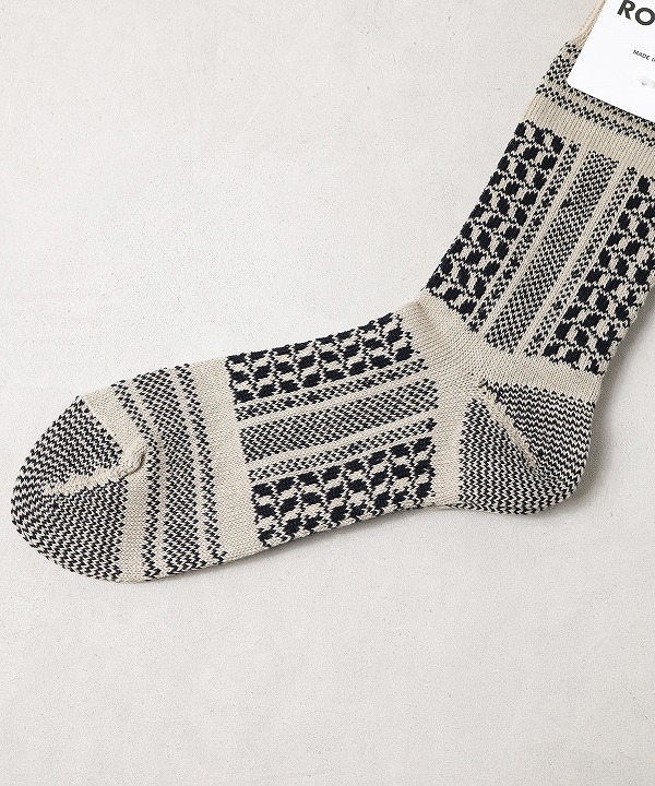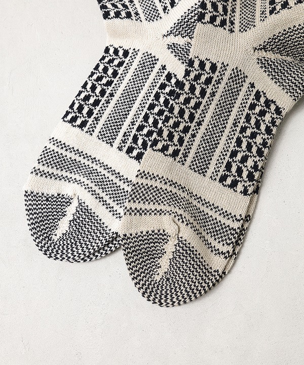 砂漠のストールとして知られる「シュマグ」の伝統的な織り柄から着想を得てデザインした、ローゲージのソックス。 コットン、リネン、ラミーをバランスよくブレンドした糸 を使用。さらりとした快適な履き心地で、自然なムラ感を 持つ糸が織りなす素朴で立体的な風合いが、異国の手織り 布のような独特の存在感と、どこか懐かしさを感じさせる パターンに仕上げました。