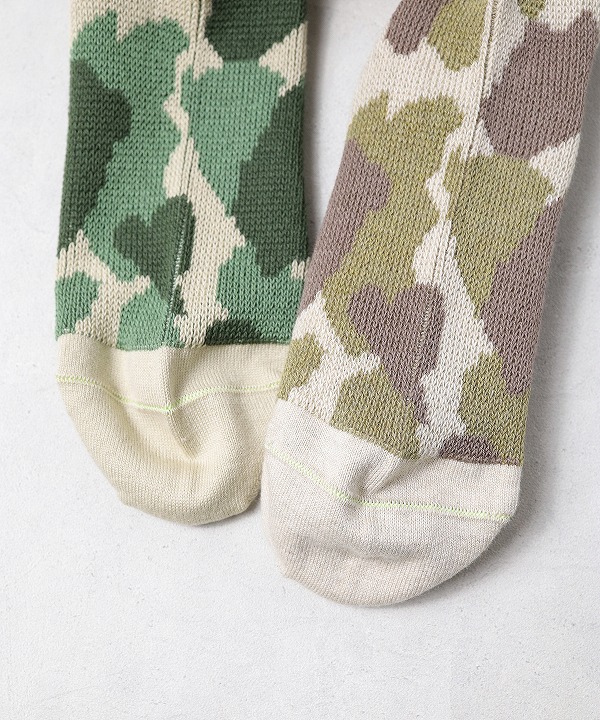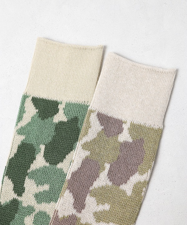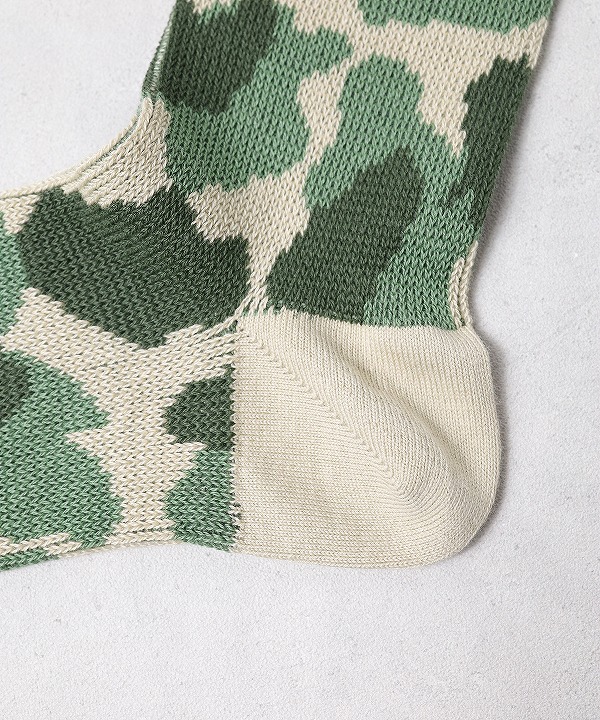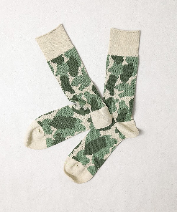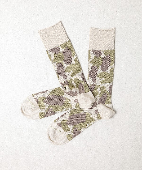 ハンティング用に開発されたカモフラージュ柄“ダックハンターカモ”をモチーフにしたソックス。自然に溶け込む有機的なパターンは、ミリタリーでも一部採用され、アウトドアの境界を越えて広まっていきました。スニーカーはもちろん革靴とも合わせやすい肉感に仕立ててあり、幅広いシーンで活躍します。