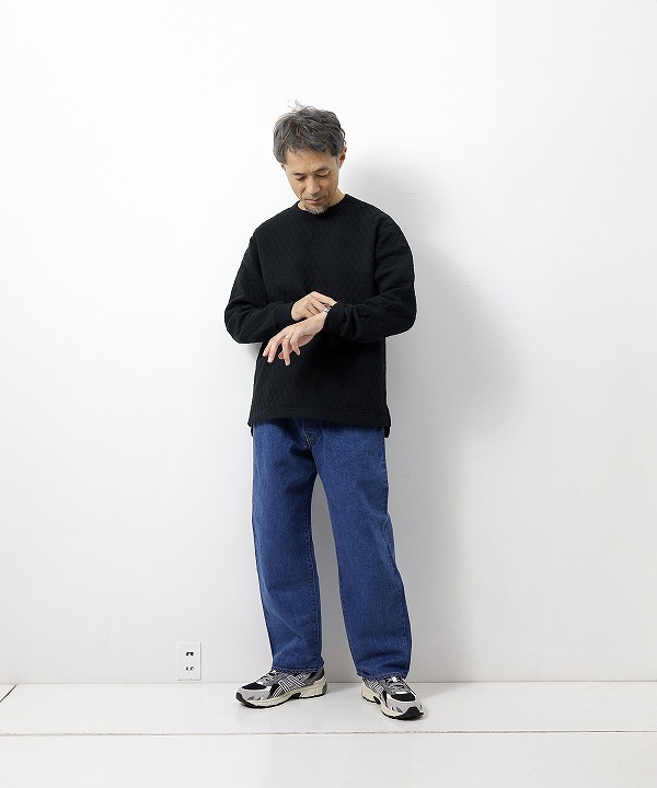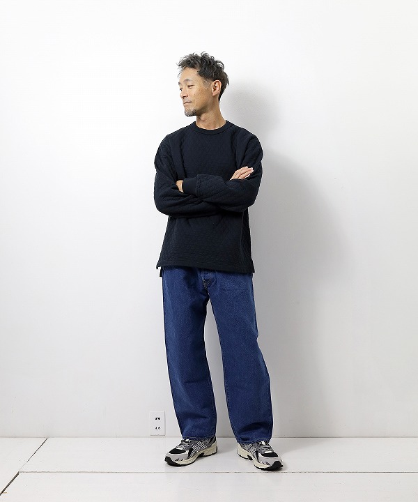 ややゆったりとしたシルエットのクルーネックで、秋冬用のインナーを中に着こんでも問題ないゆとりがあります。
